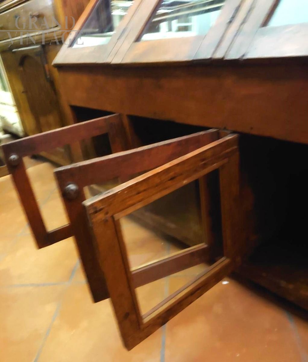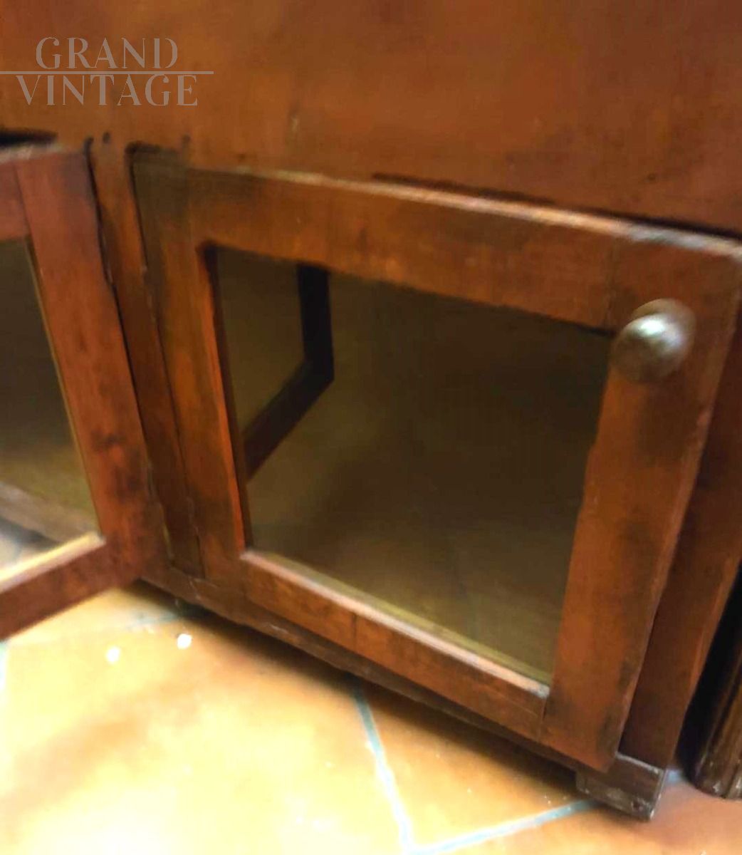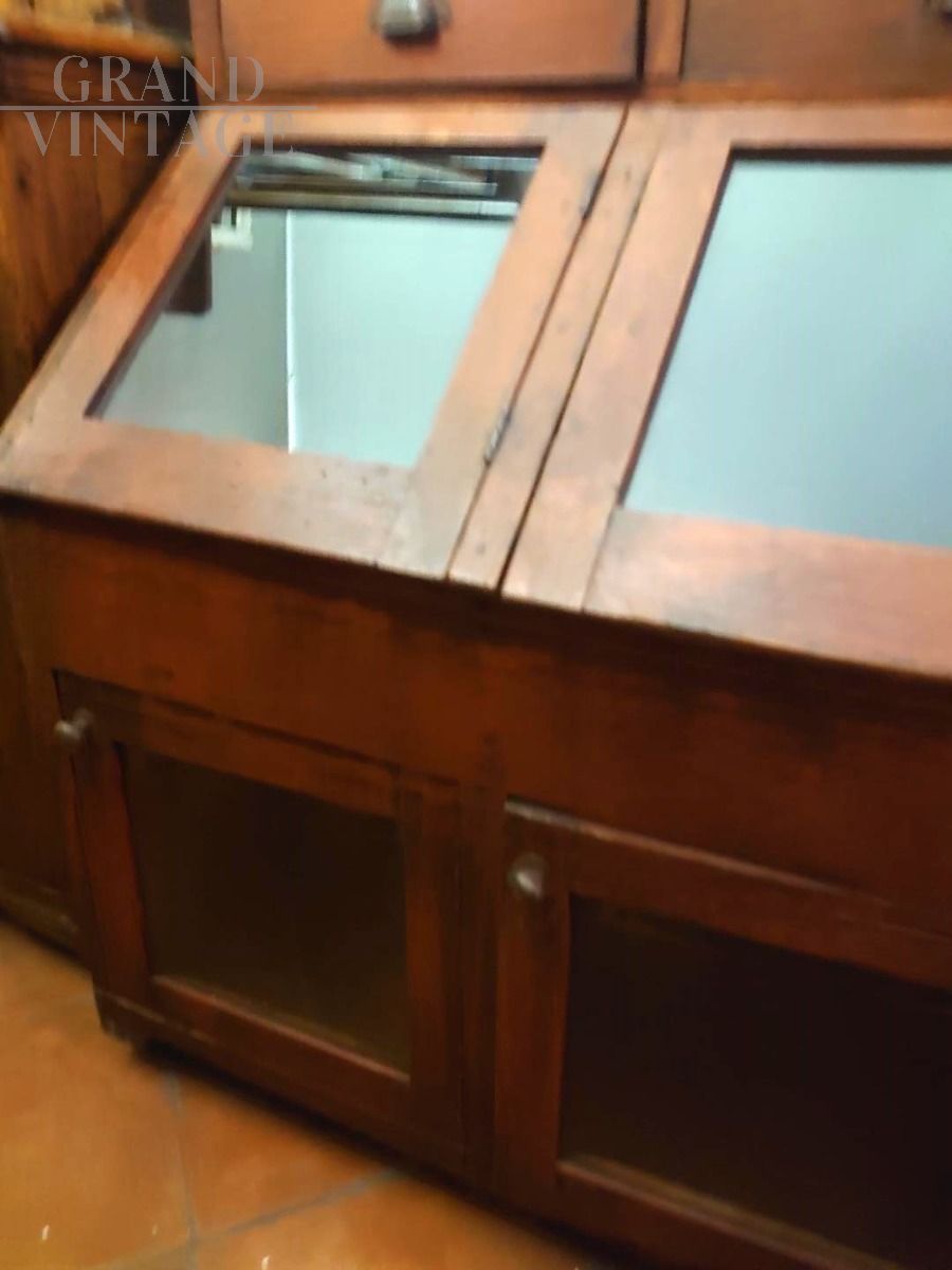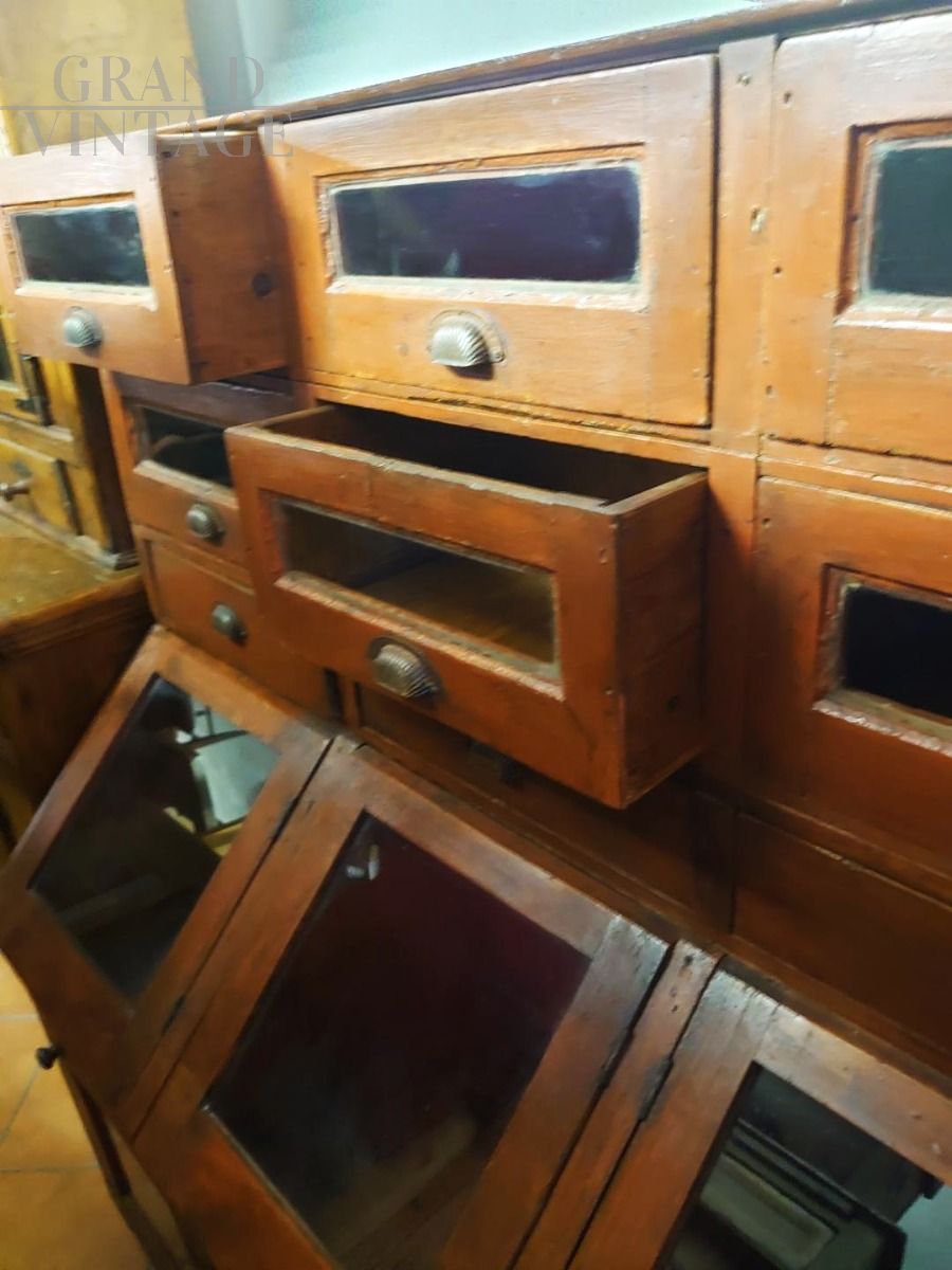 Mobile da negozio in abete, in pittura originale bordeaux, della fine dell'800, in 3 corpi. Il corpo superiore è caratterizzato da 6 cassetti con vetro e 3 piccoli cassetti in legno, il corpo centrale è composto da vani con ante a vetro apribili a ribalta, mentre la parte inferiore è caratterizzata da tre scomparti chiusi da antine in con vetro.