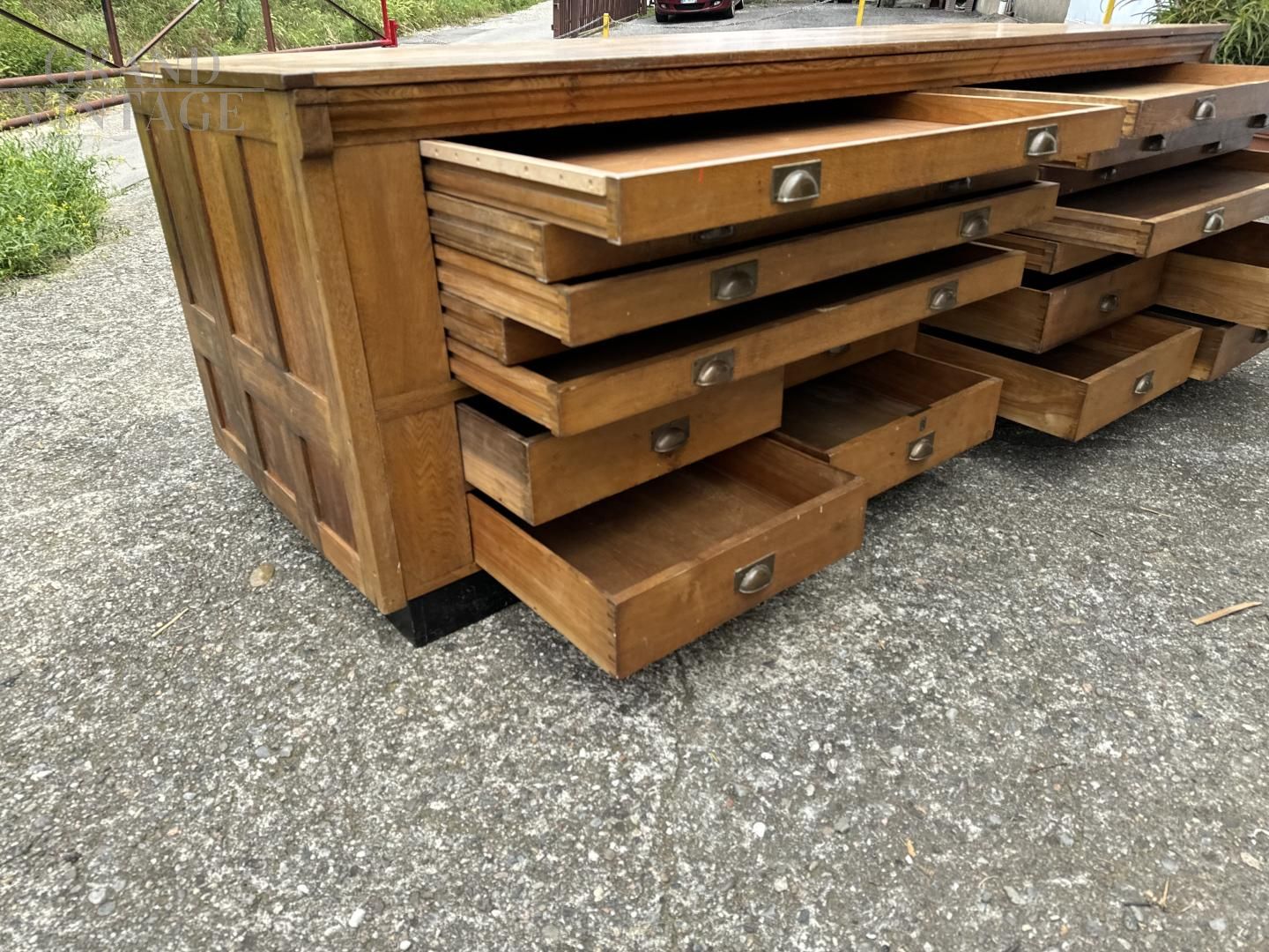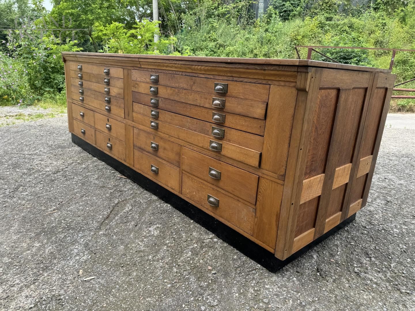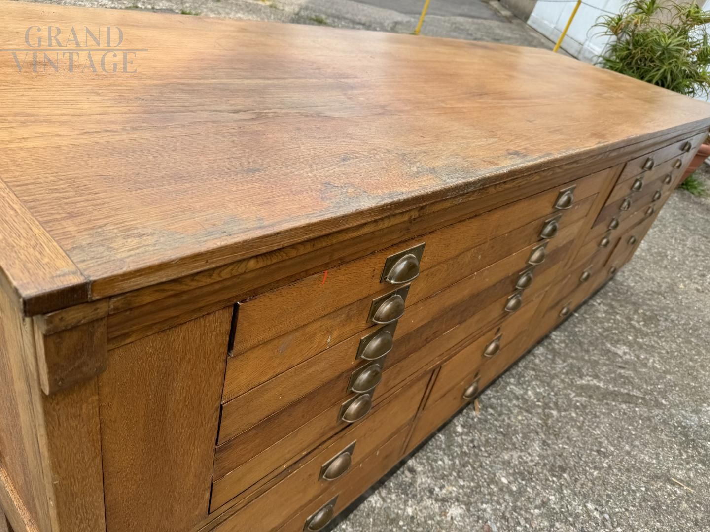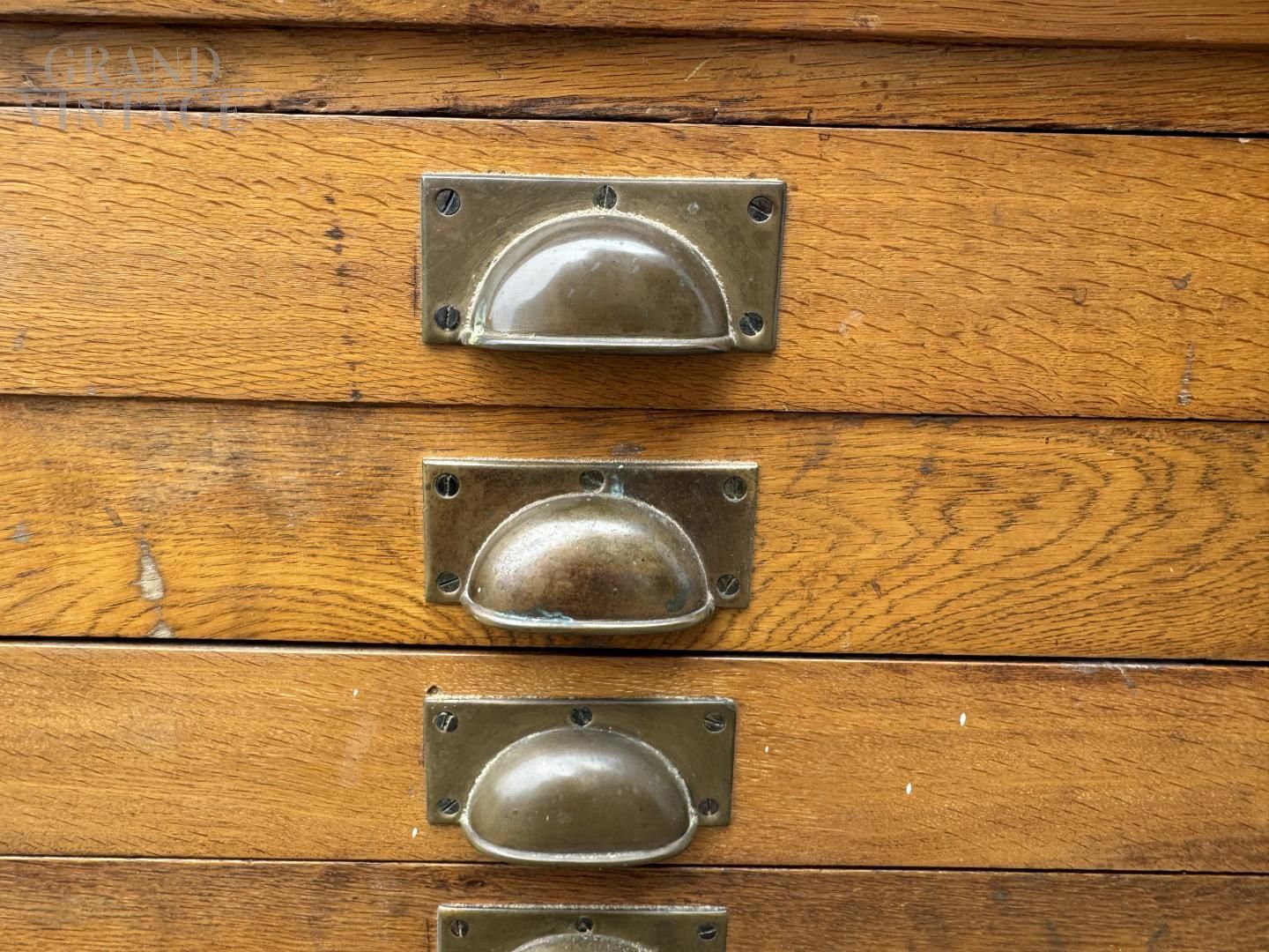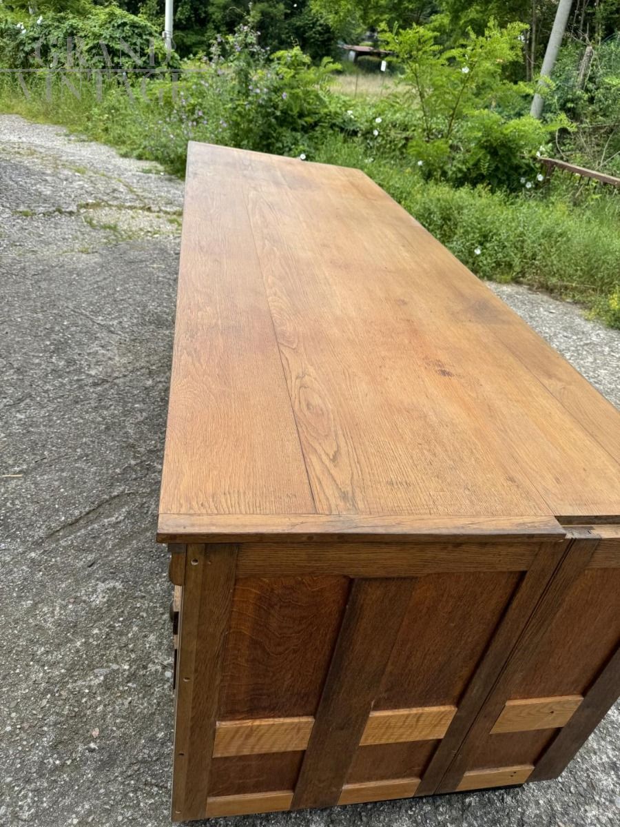Mobile bancone da merceria a cassetti in rovere massiccio