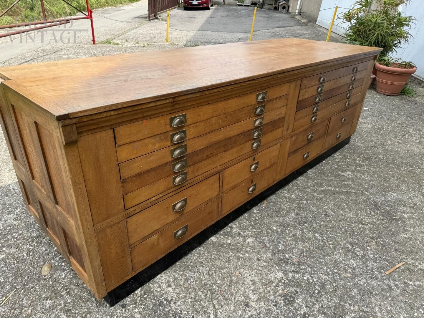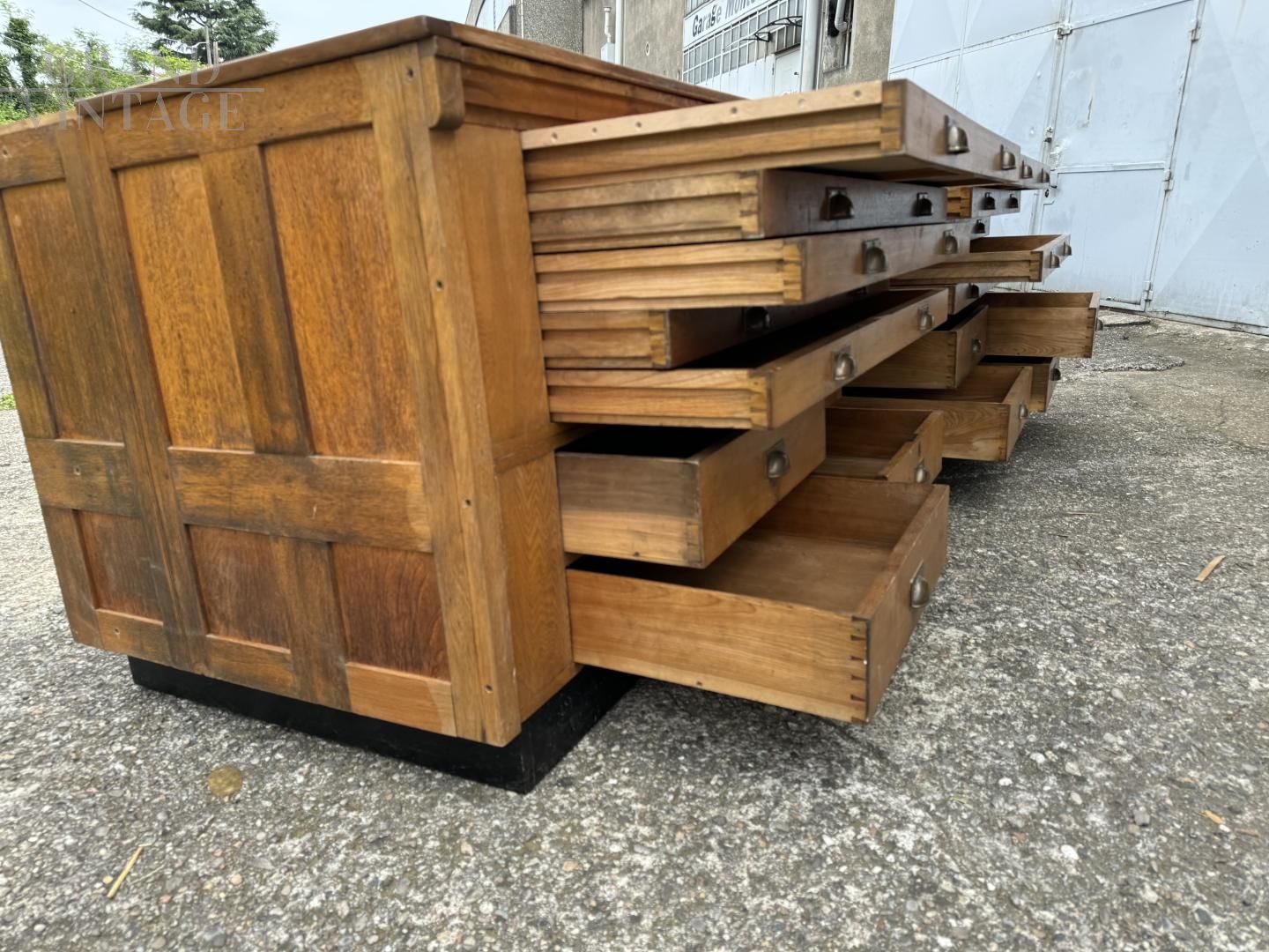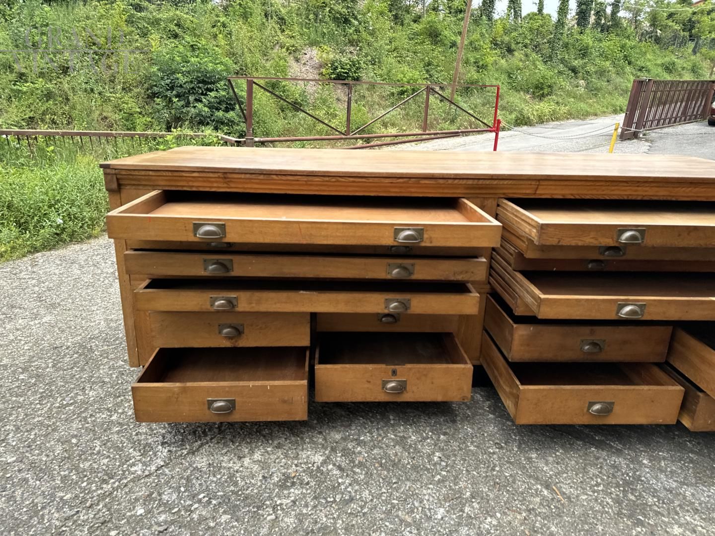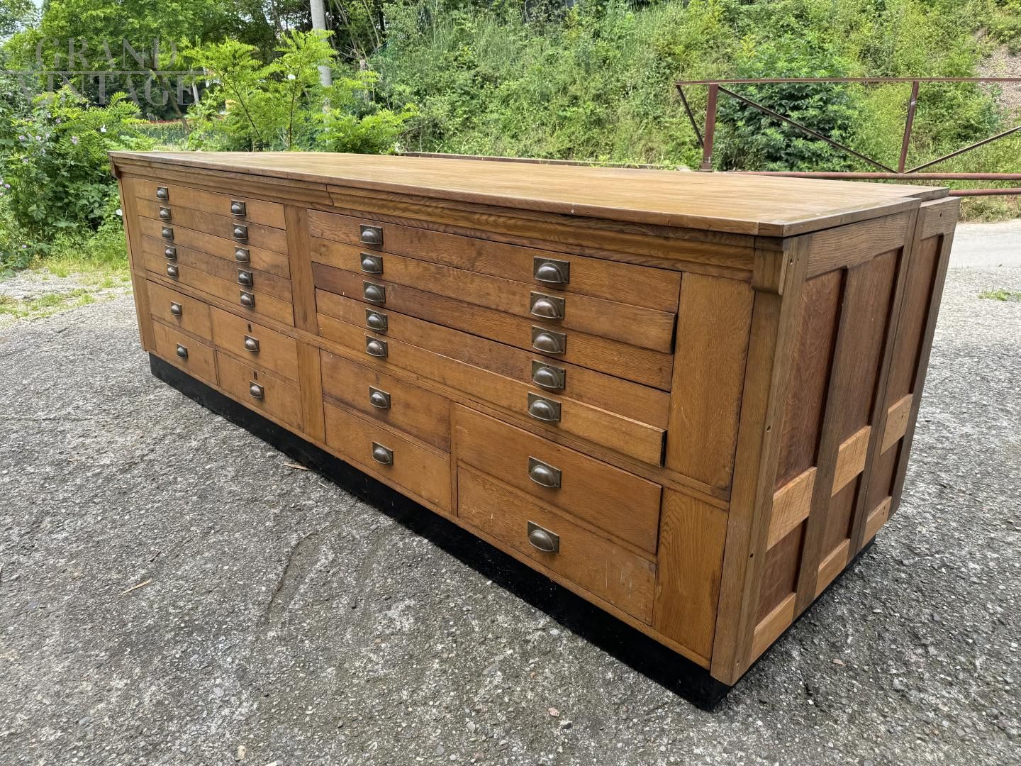 Mobile bancone da merceria a cassetti in rovere massiccio