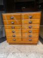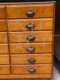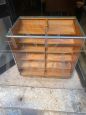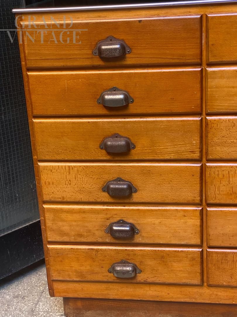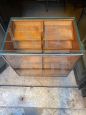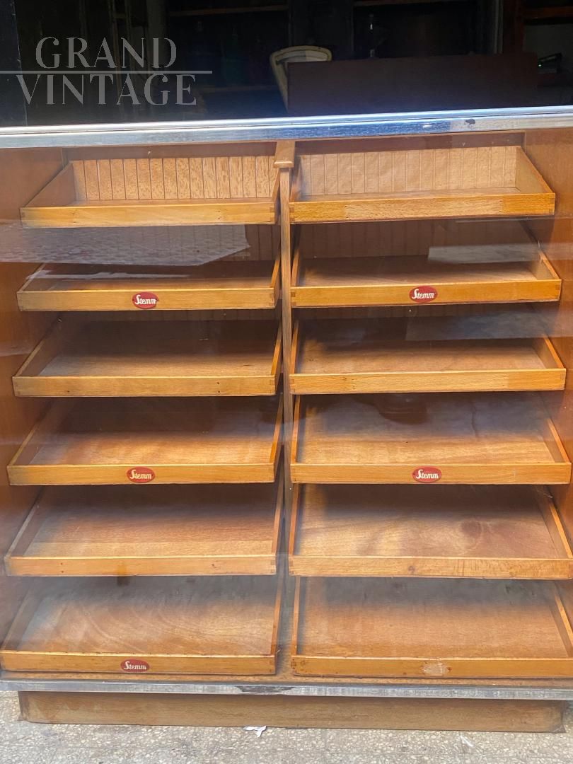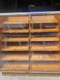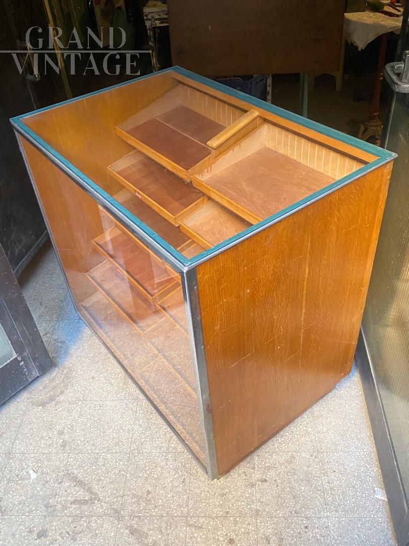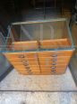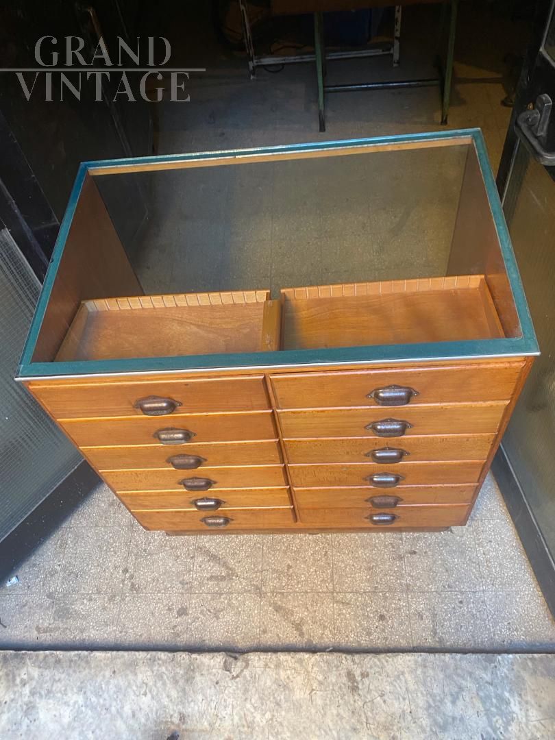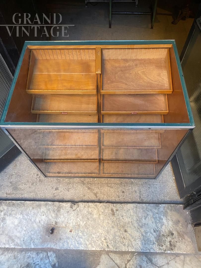 Mobile banco espositore vintage proveniente da un antico negozio inglese, la parte frontale è in vetro per mostrare la merce esposta, il retro è composto da una bella cassettiera in legno con maniglie a conchiglia in metallo. Raro e molto bello, in ottime condizioni.