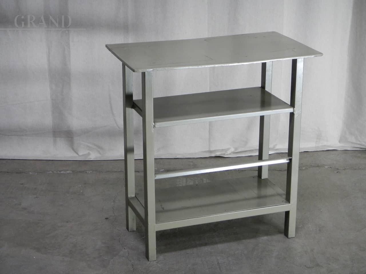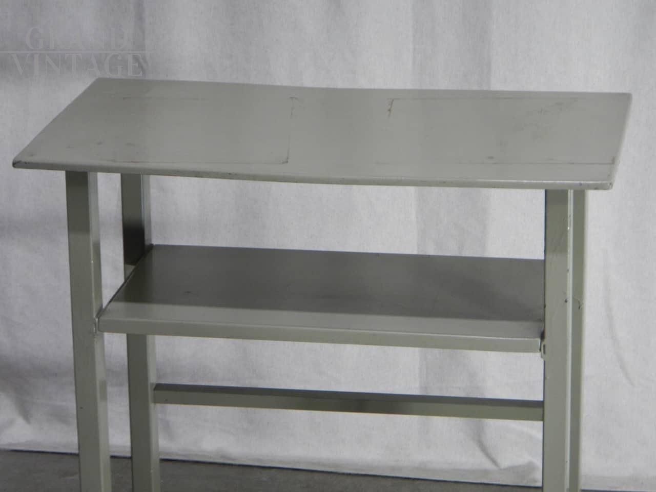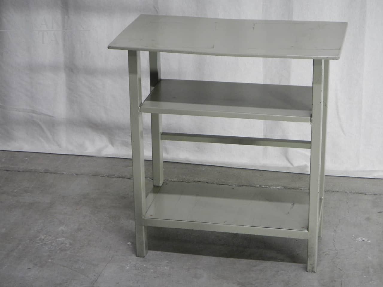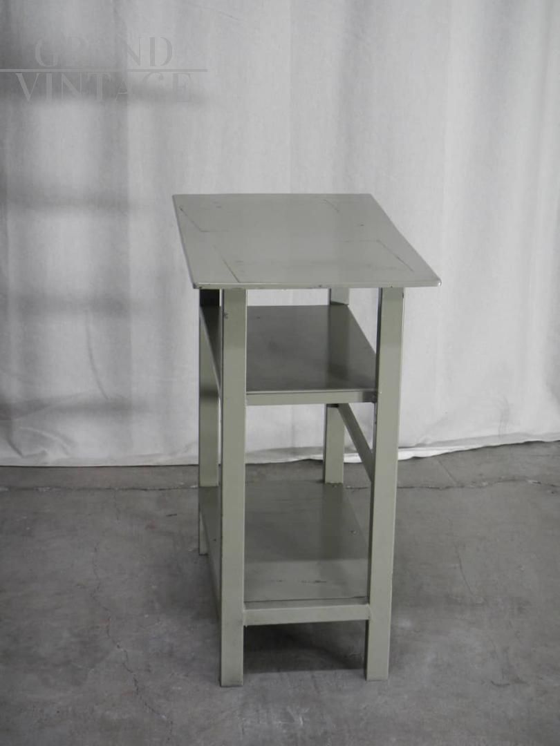 Piccolo mobile console libreria da ufficio in ferro laccato grigio, stile industriale anni '70.