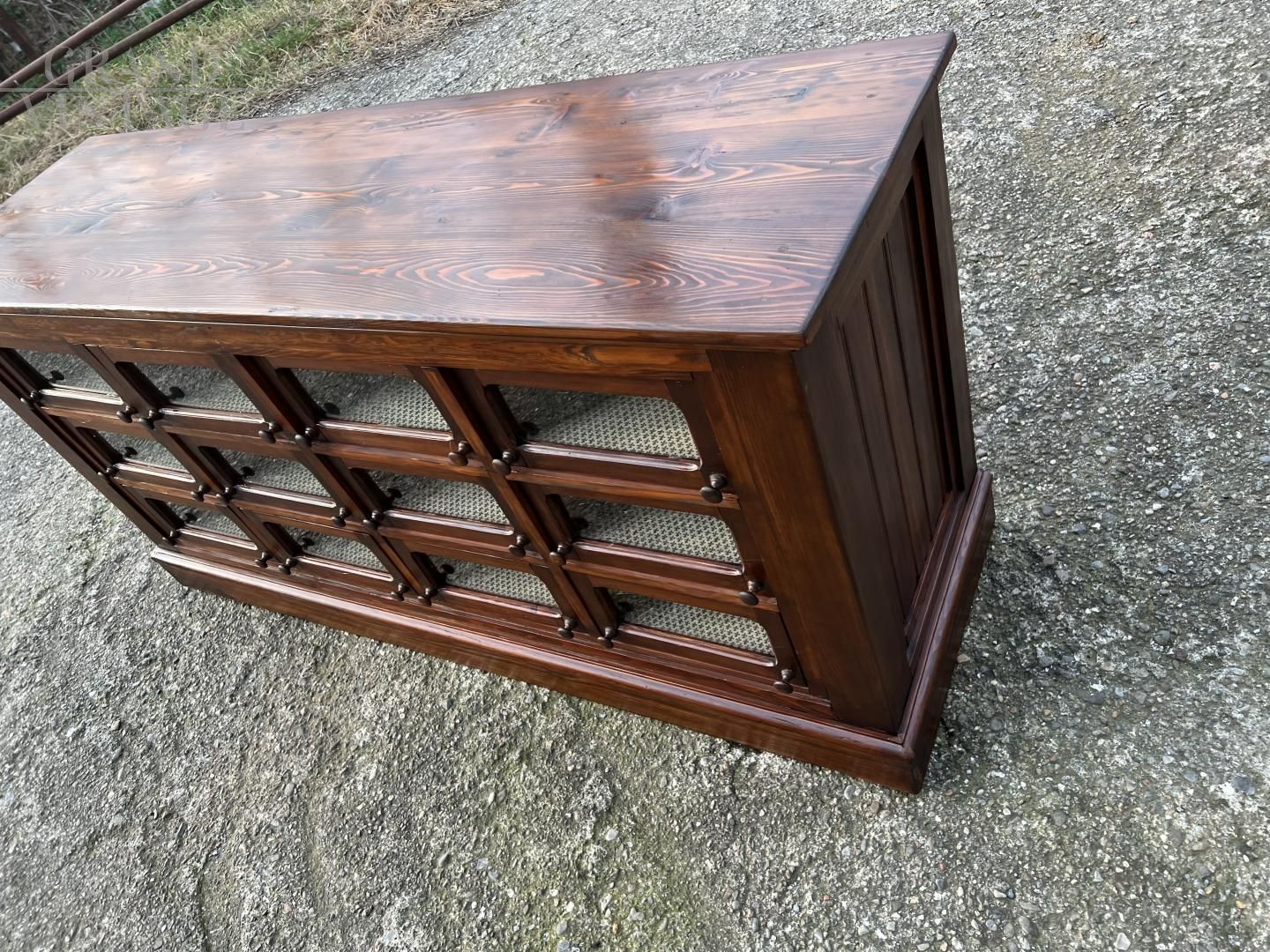 Stupendo mobile pastaia da negozio in larice massiccio con 12 cassetti a vetro, completamente originale e da poco restaurato, proveniente da uno storico negozio di alimentari di Milano.