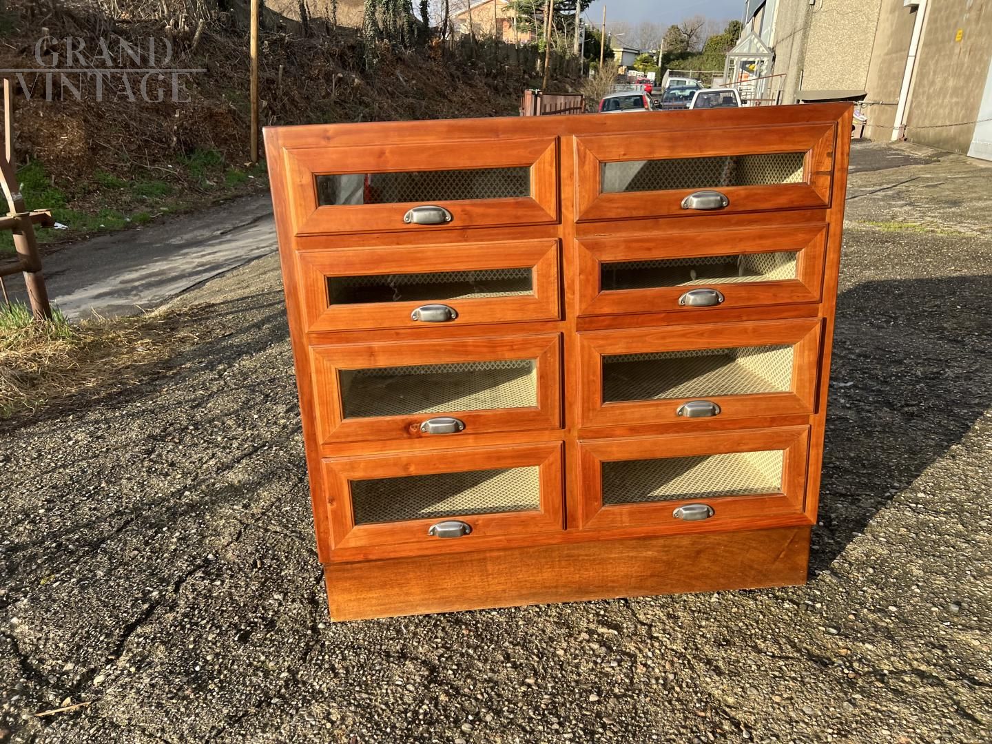 Stupendo mobile pastaia antico in ciliegio con 8 cassetti con vetro, proveniente da uno storico negozio di alimentari di Verona, da poco restaurato e completamente originale.