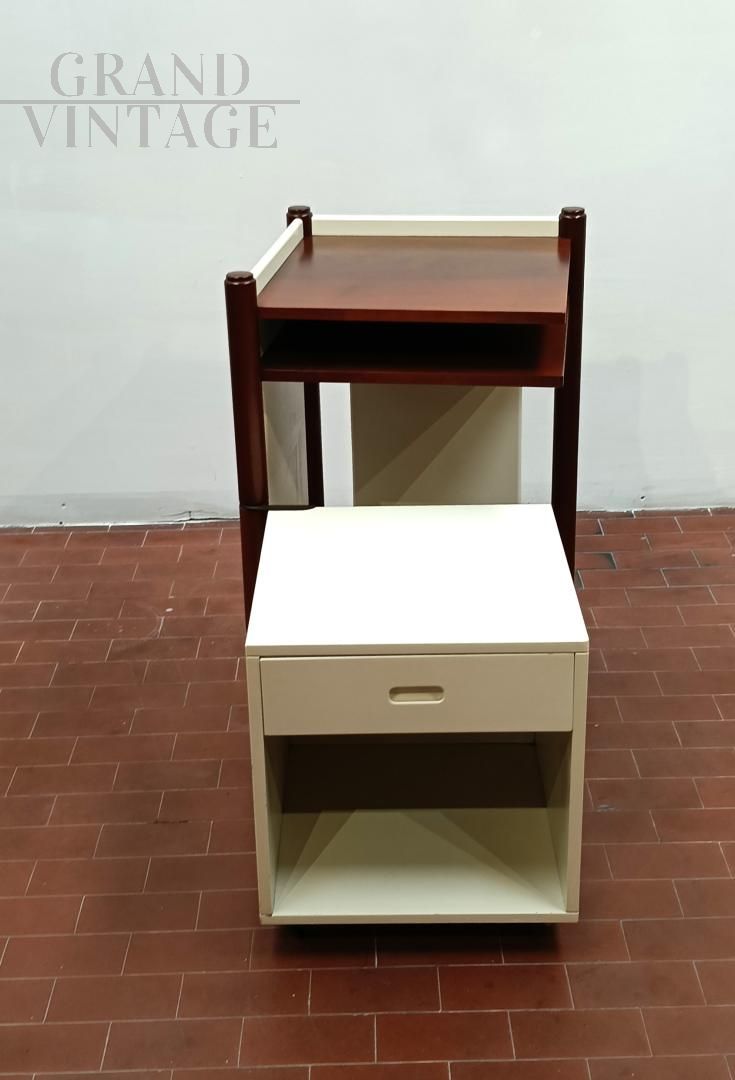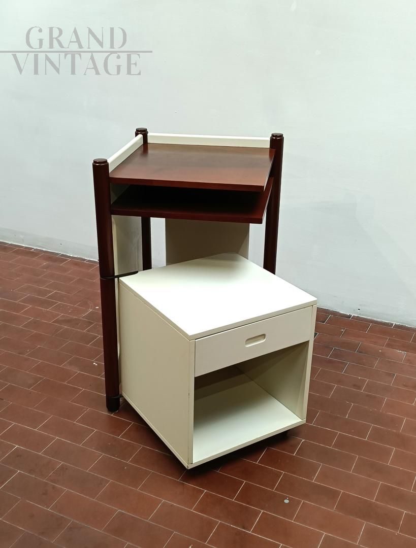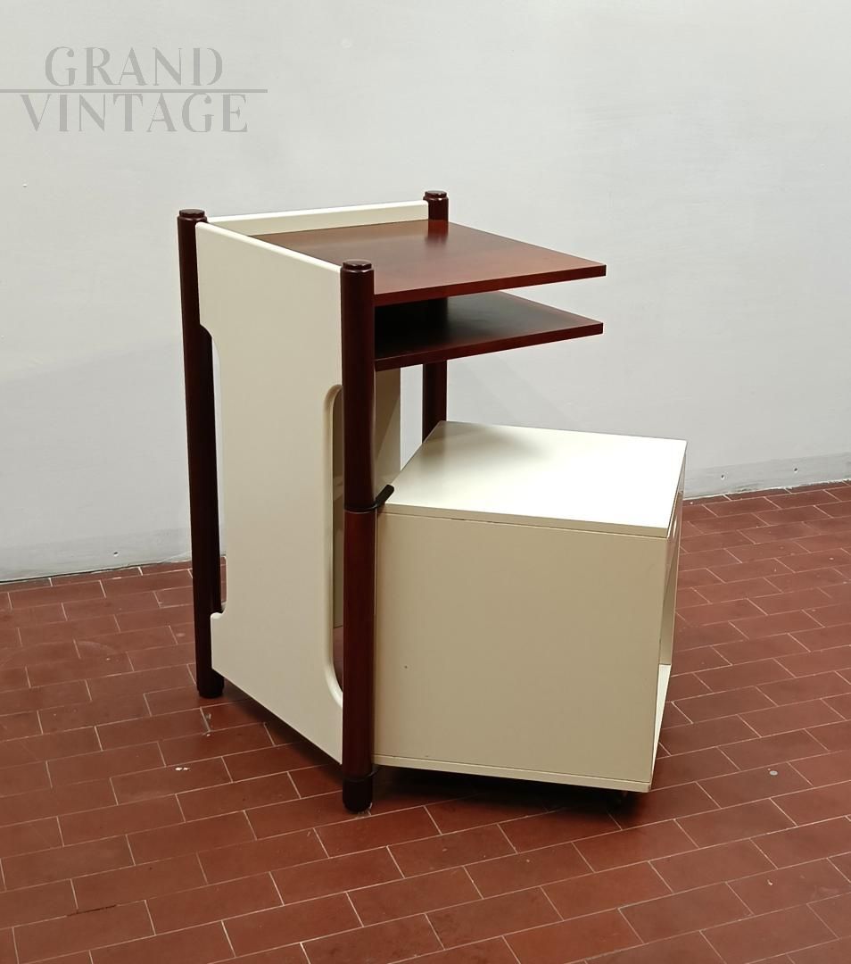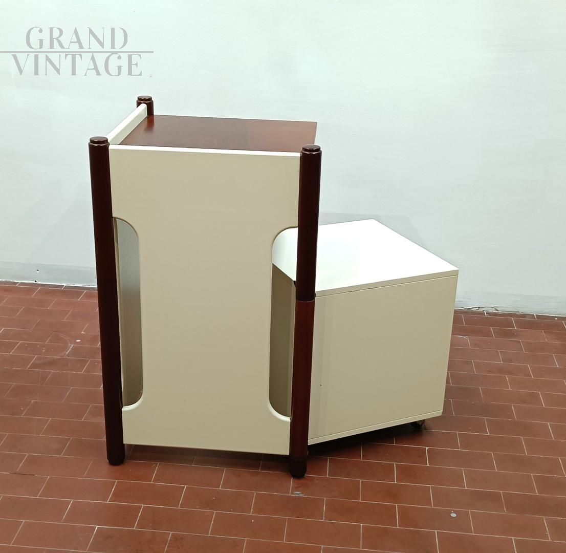 Mobiletto o comodino componibile vintage italiano anni '60 composto da un blocco fisso con ripiani e da un cubo (40 x 40 x 40 cm) su ruote con cassetto che può ruotare attorno ad una gamba del blocco mobile. L'uso del cubo era funzionale per sedersi durante le telefonate con telefono fisso. Mobile robusto e stabile. La struttura è completamente in legno, in parte laccato ed in parte legno di noce Tanganica. Conservato benissimo.