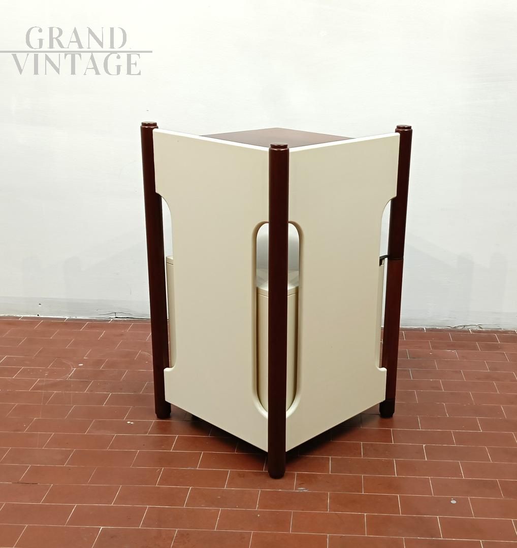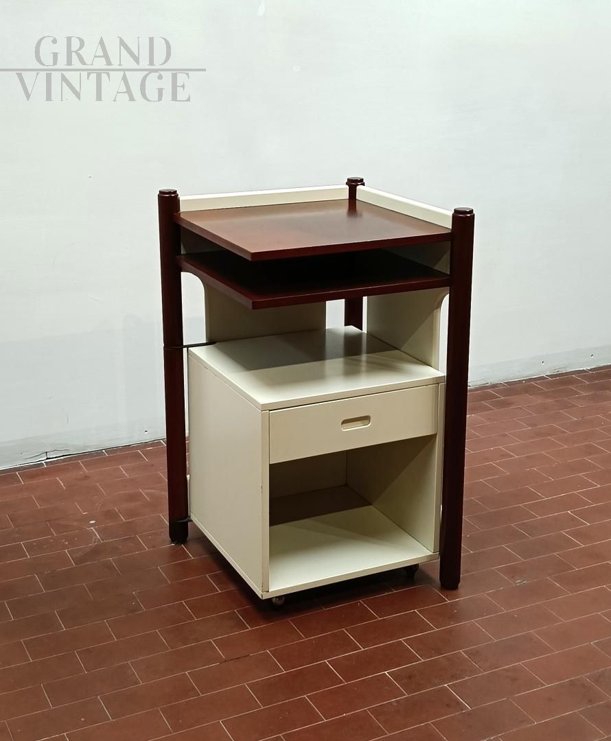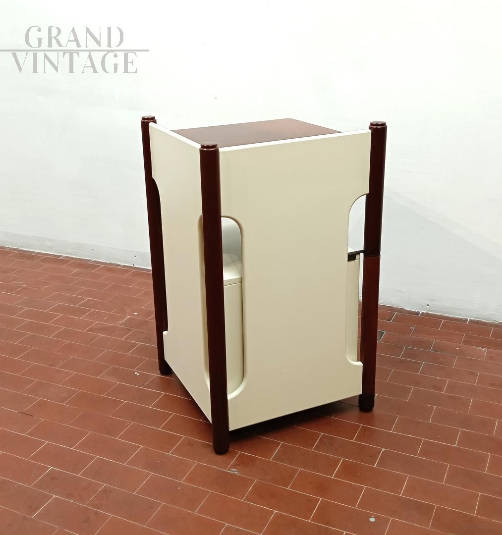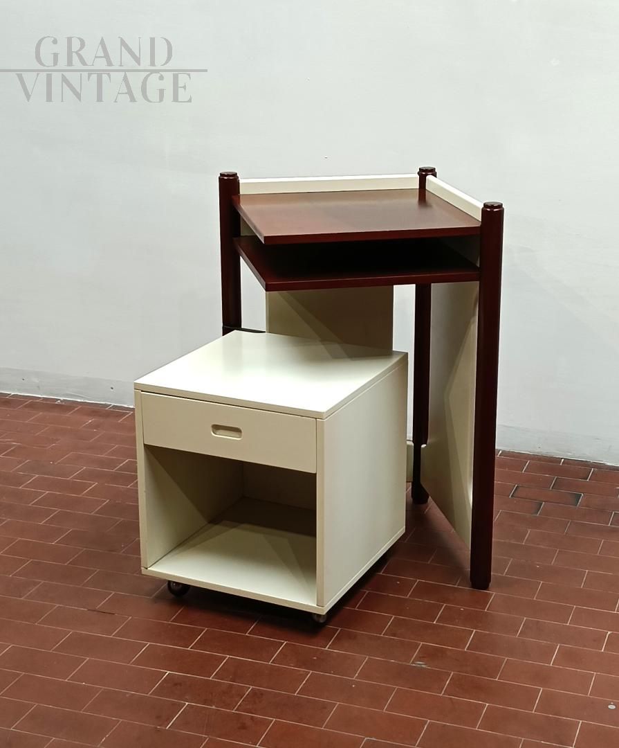 Mobiletto o comodino componibile vintage italiano anni '60 composto da un blocco fisso con ripiani e da un cubo (40 x 40 x 40 cm) su ruote con cassetto che può ruotare attorno ad una gamba del blocco mobile. L'uso del cubo era funzionale per sedersi durante le telefonate con telefono fisso. Mobile robusto e stabile. La struttura è completamente in legno, in parte laccato ed in parte legno di noce Tanganica. Conservato benissimo.