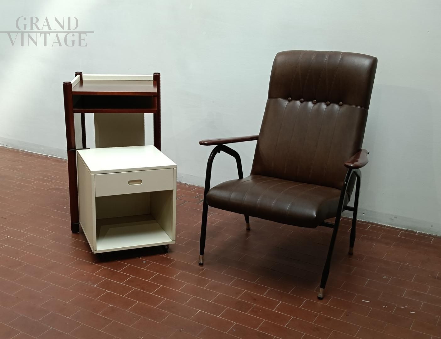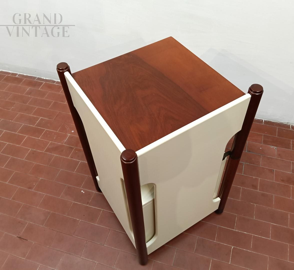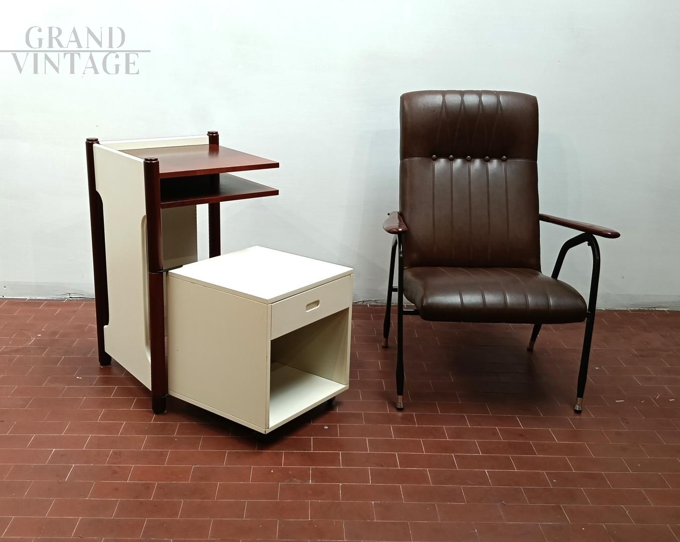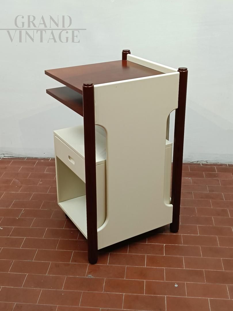 Mobiletto o comodino componibile vintage italiano anni '60 composto da un blocco fisso con ripiani e da un cubo (40 x 40 x 40 cm) su ruote con cassetto che può ruotare attorno ad una gamba del blocco mobile. L'uso del cubo era funzionale per sedersi durante le telefonate con telefono fisso. Mobile robusto e stabile. La struttura è completamente in legno, in parte laccato ed in parte legno di noce Tanganica. Conservato benissimo.