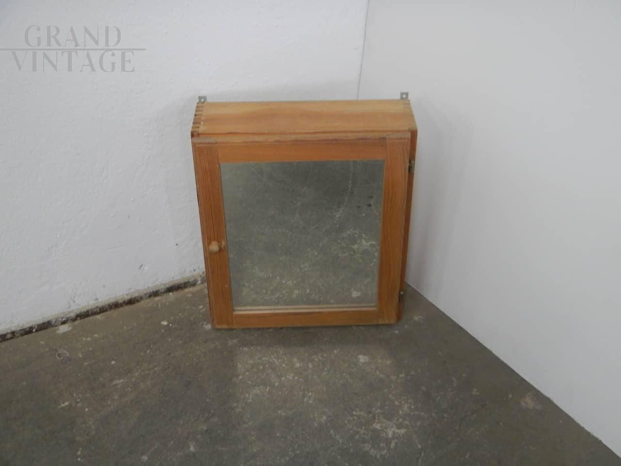 Mobiletto pensile da bagno vintage in abete con anta a specchio e con mensola interna, perfetto per un arredamento rustico.