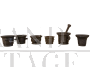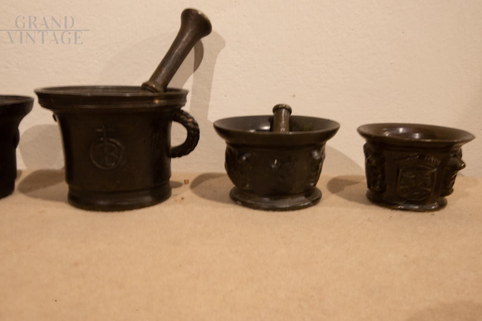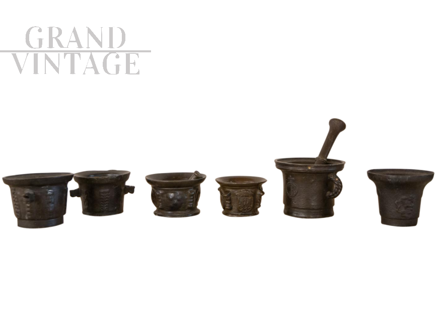 Collezione di 6 mortai + 2 pestelli rinascimentali in bronzo.