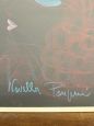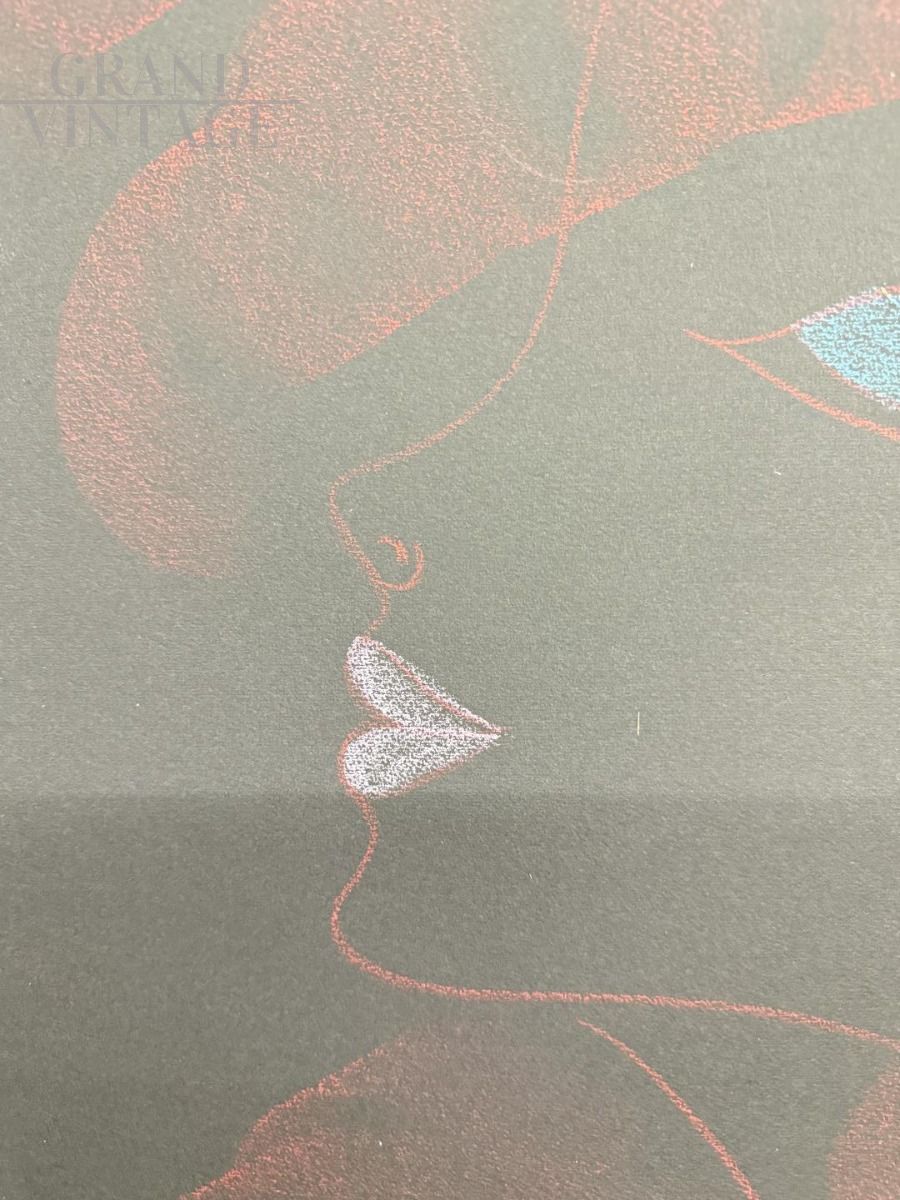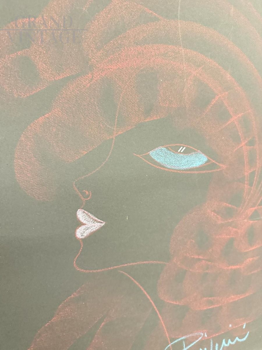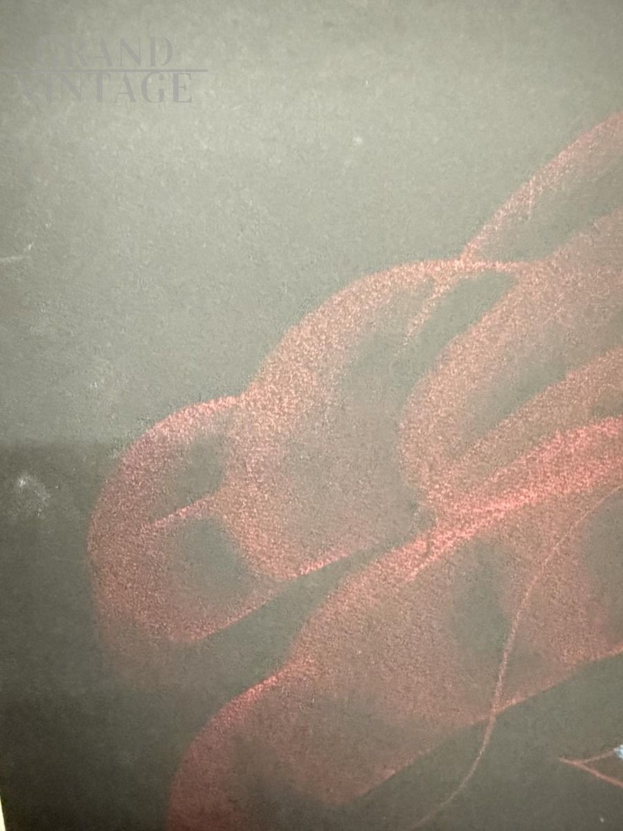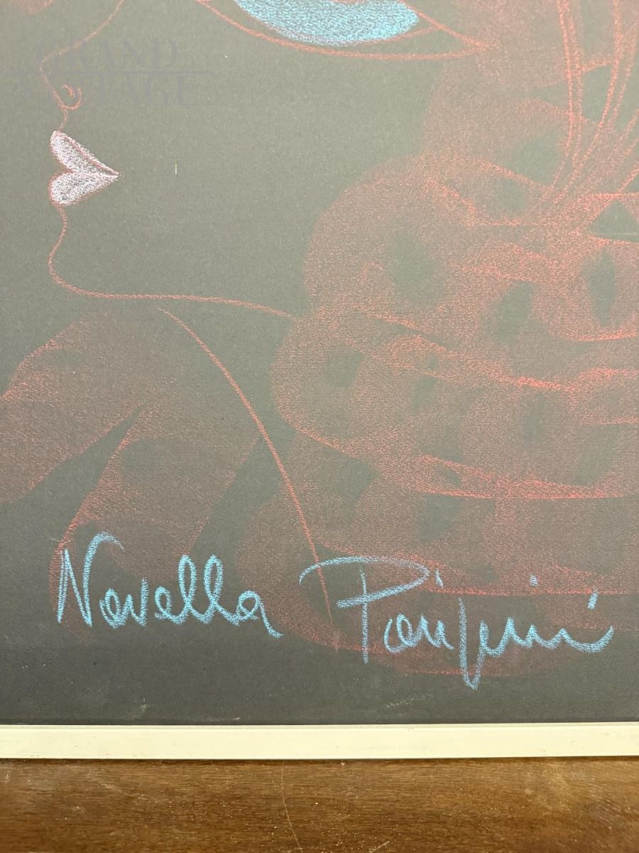 Dipinto anni '60 di Novella Parigini con volto ritratto di donna a colori su stondo nero tecnica a gessetti colorati. La pittrice italiana Novella Parigini dipinse le sue opere nella corrente moderna esistenzialista. L'opera misura 73 x 53 cm ed è già incorniciata. In stato molto buono.