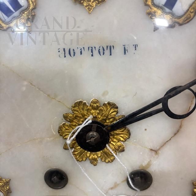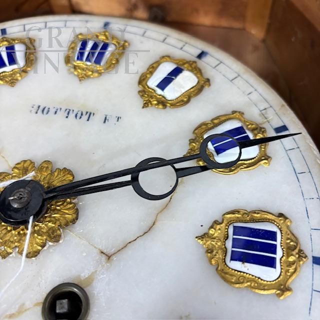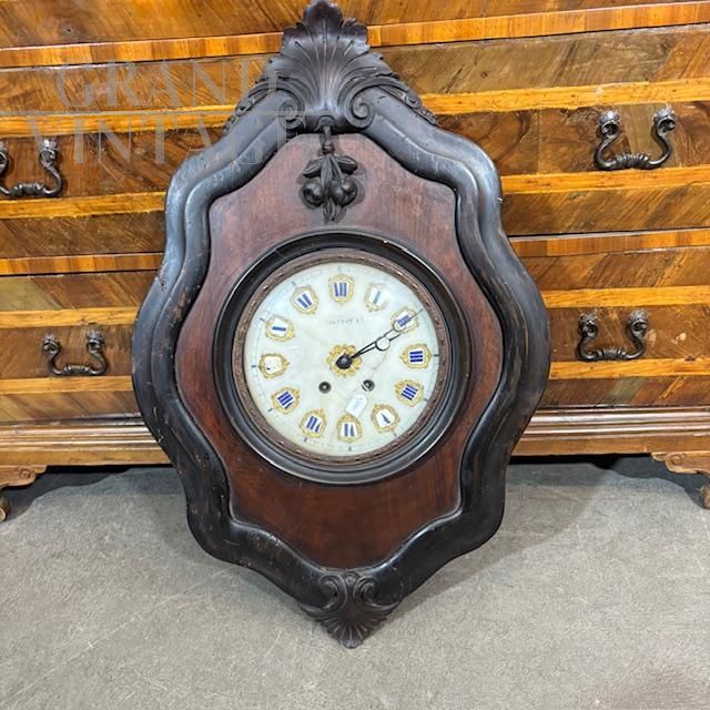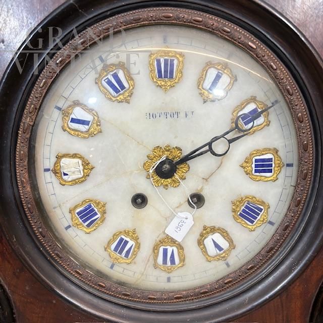 Orologio da parete antico detto a Occhio di Bue con cornice in legno di noce e palissandro dalla bella forma sagomata, il quadrante è in marmo firmato Hottot e i numeri in caratteri romani sono dipinti in colore blu su ceramica. Provenienza: Francia del periodo Luigi Filippo, 1850. In buono stato di conservazione, il meccanismo è funzionante ma non revisionato. Conservato nella sua patina originale, presenta i naturali segni del tempo.