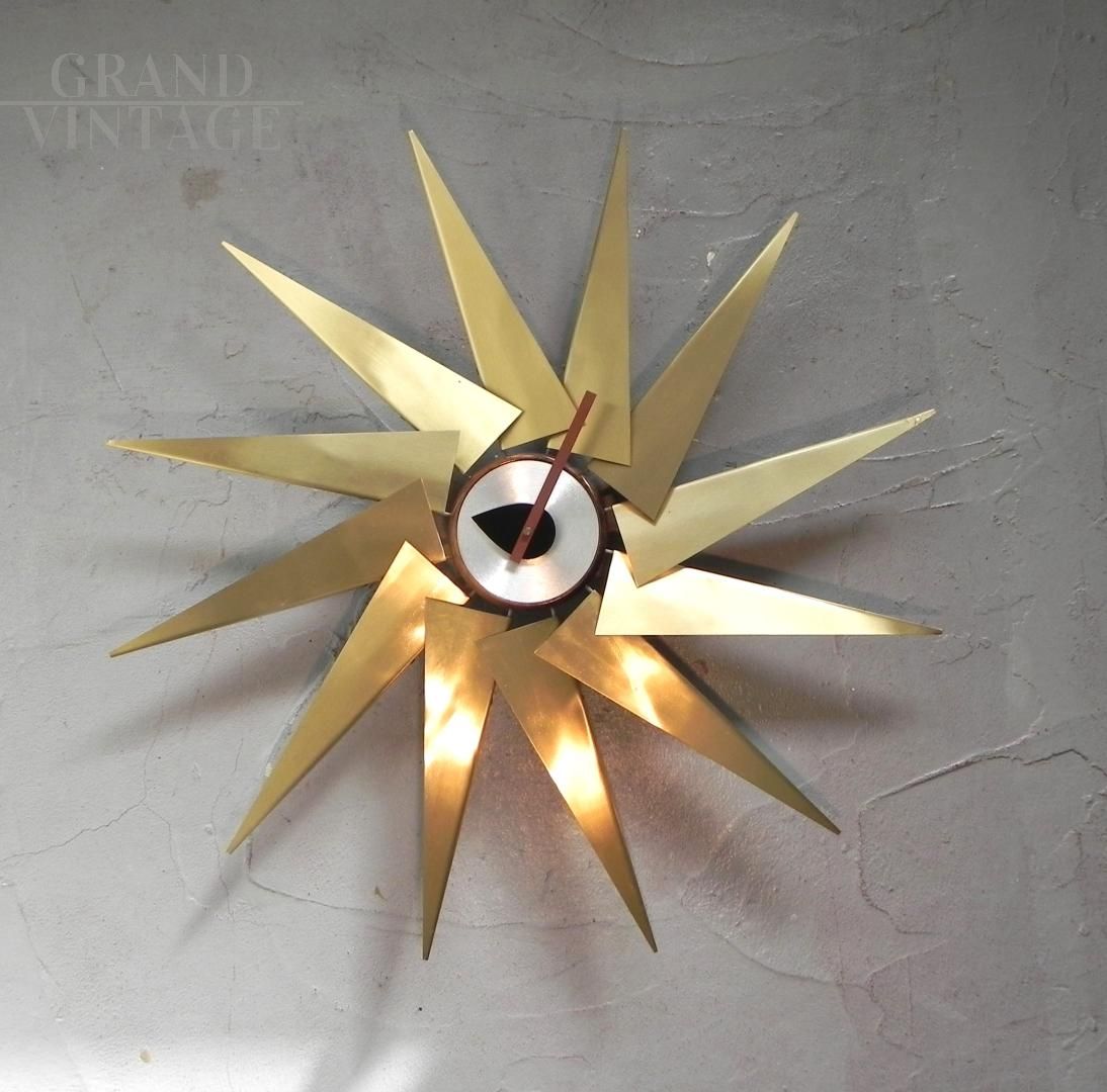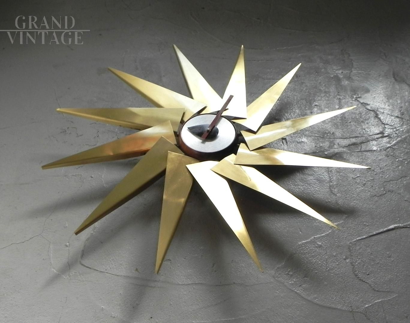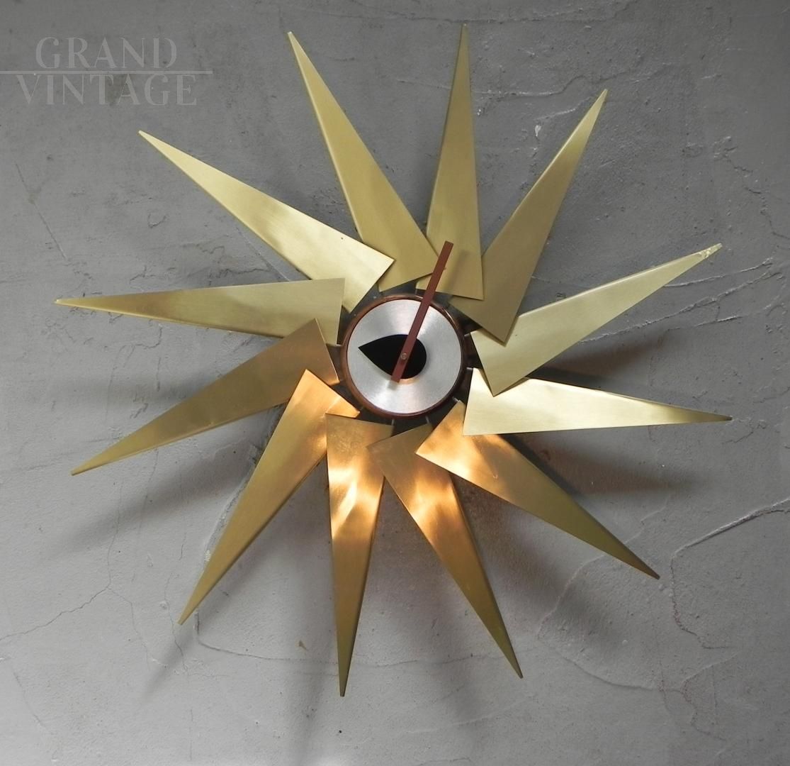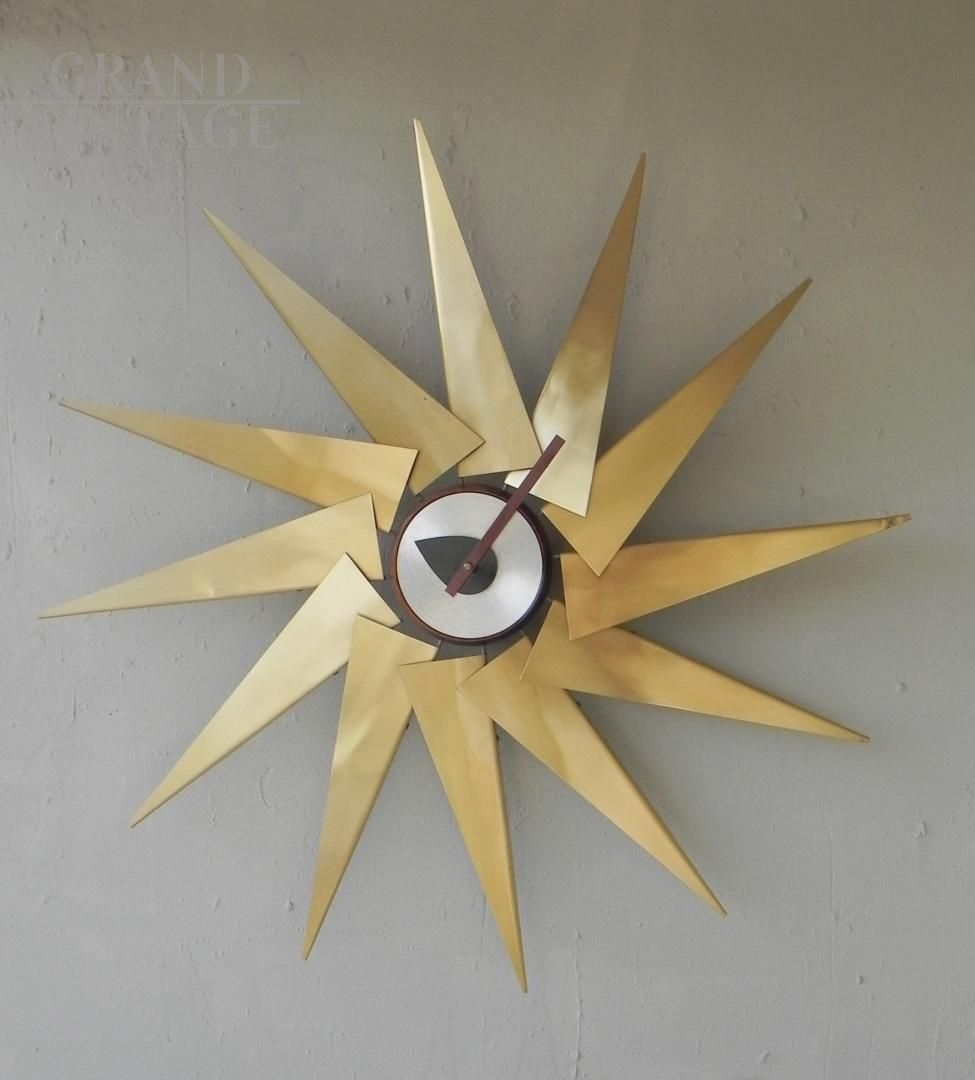 Orologio design vintage in stile Turbine Clock di George Nelson per Vitra, realizzato negli anni '90 con un elemento centrale rivestito in legno pregiato e raggi in ottone massiccio. L'orologio presenta i naturali segni d'uso e qualche difetto sui raggi.
