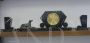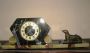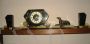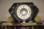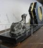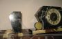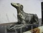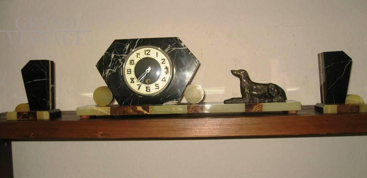 Orologio Art Déco da tavolo in marmo antico, trittico con cane, epoca anni '30. Modello decò, costruito con diversi tipi di marmo e alabastro. Base rettangolare lunga cm. 53 con orologio funzionante, cane in metallo argentato che poggia sulla base dell'orologio, e due ornamenti ad obelisco ai lati. Ottime condizioni, manca chiave per carica orologio n° 4.