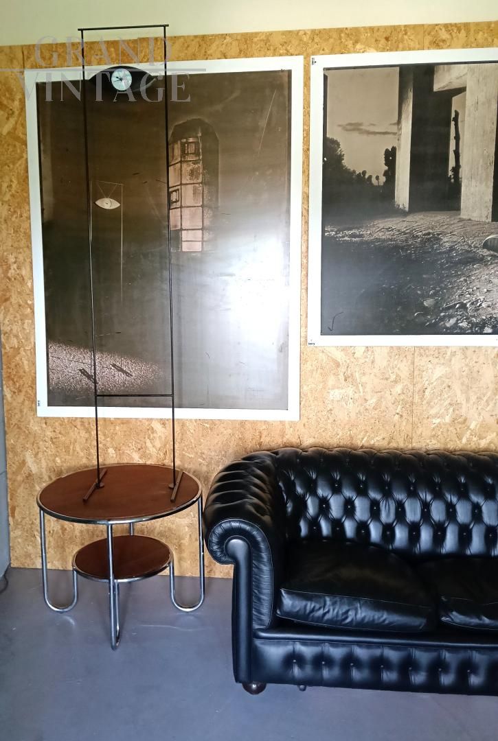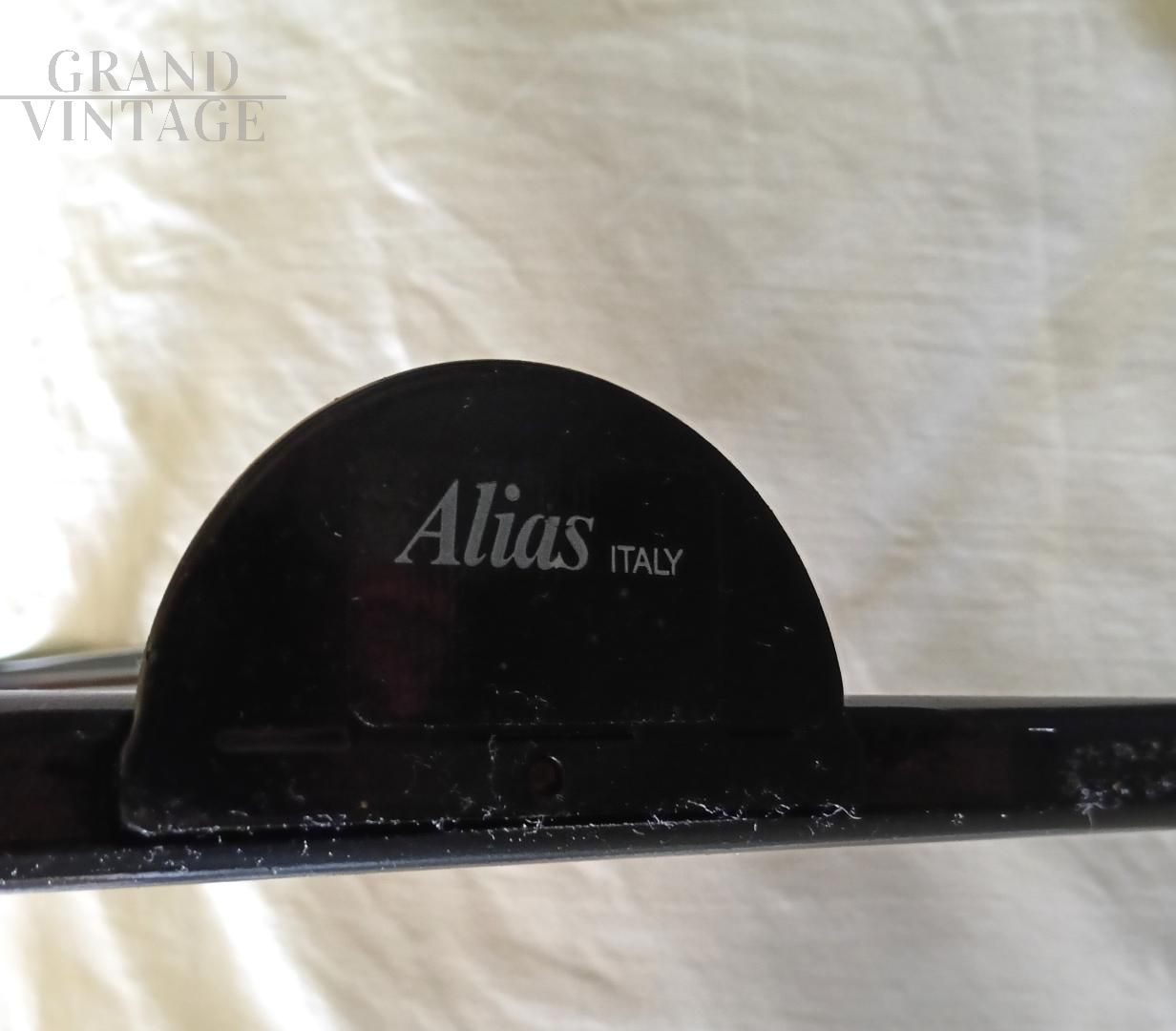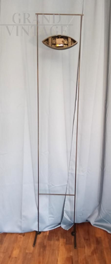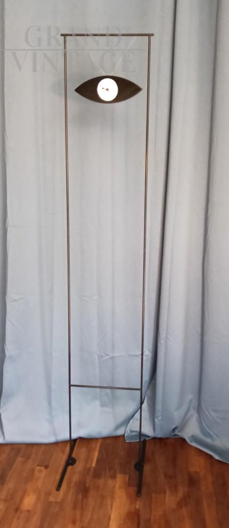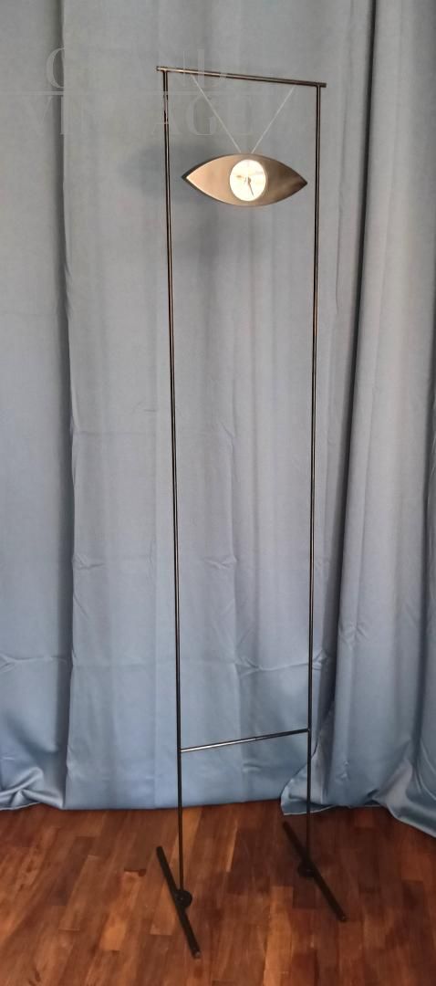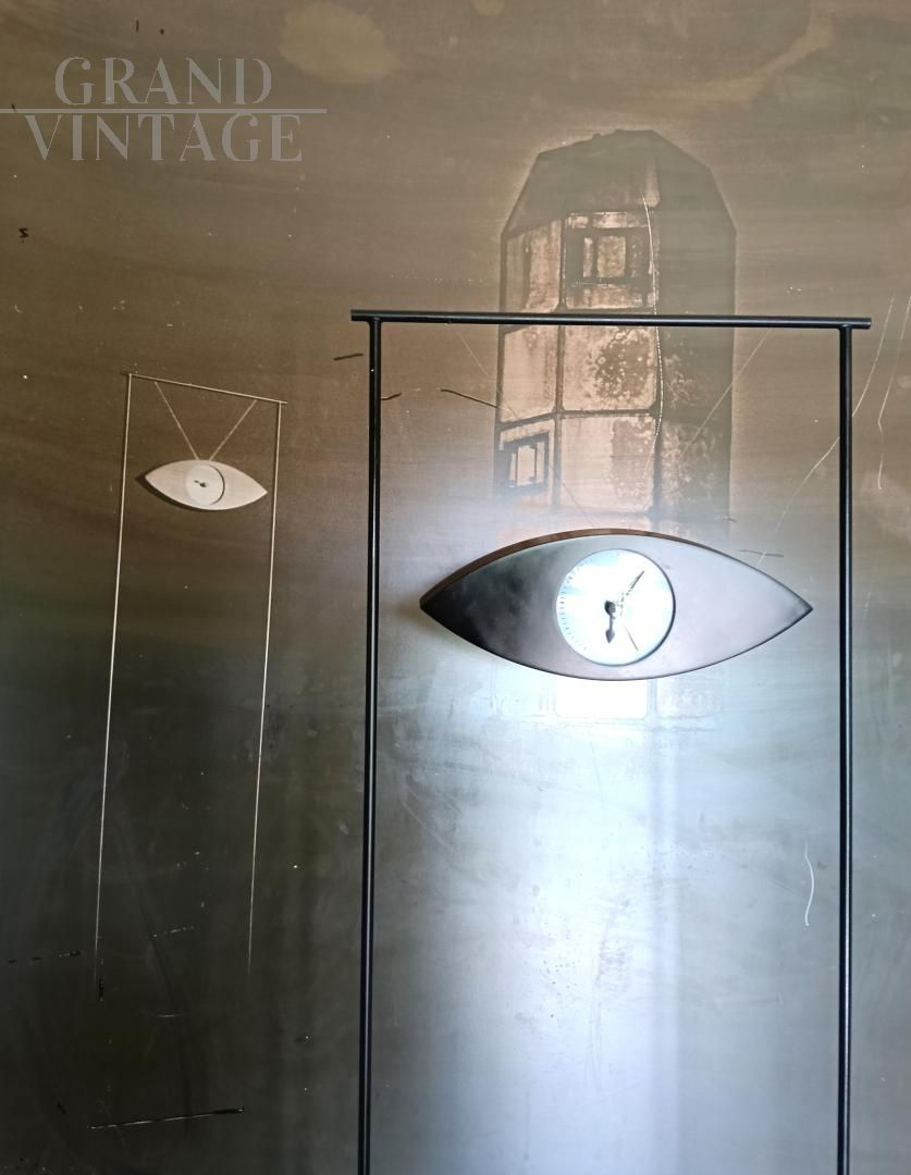 Orologio da terra Alias di Carlo Forcolini dalla affascinante forma ad occhio con fantasia di nuvole che ricorda i dipinti di Magritte, design italiano anni '80. La struttura è in acciaio. Questo orologio venne ripreso anche da Simongavina con il pezzo di design Le Temoin. Funzionamento a pile.