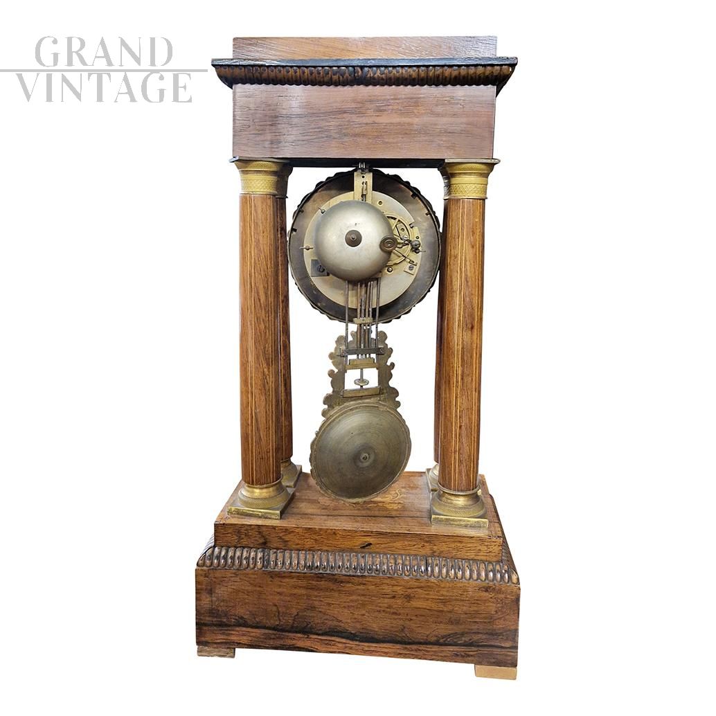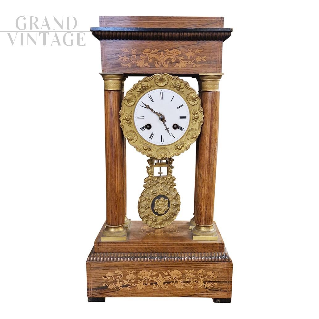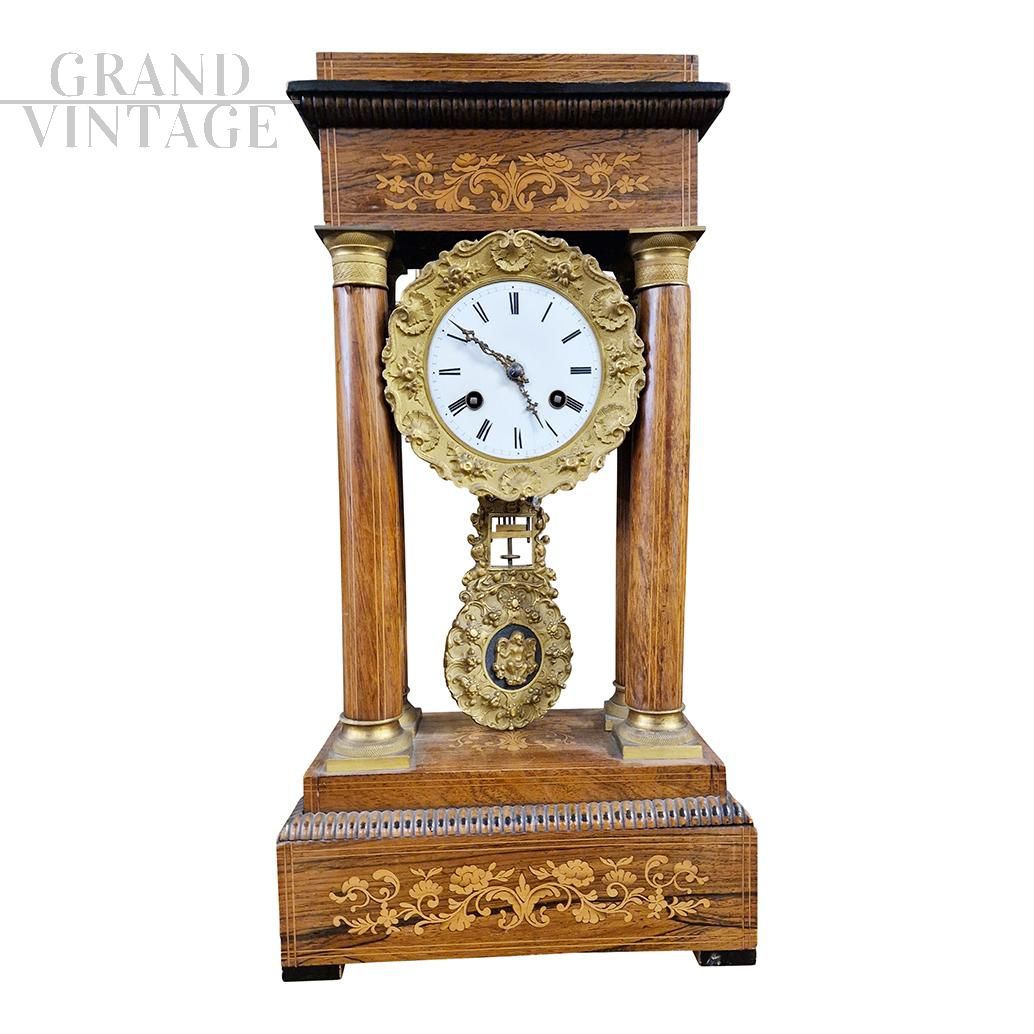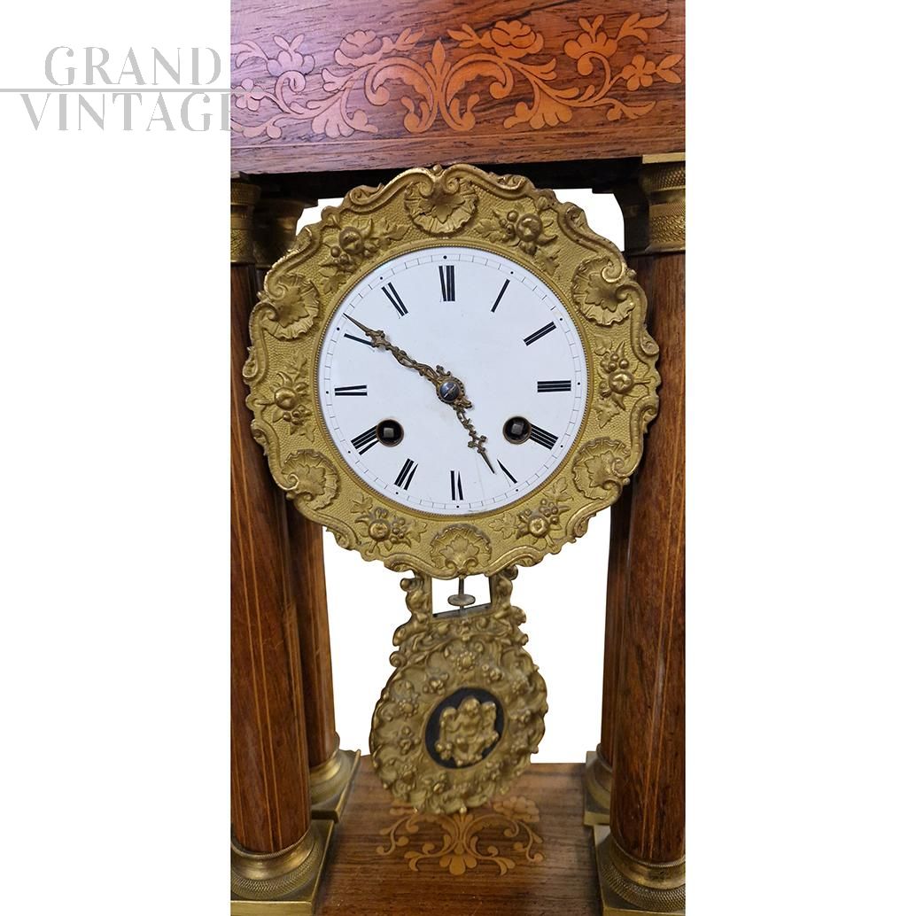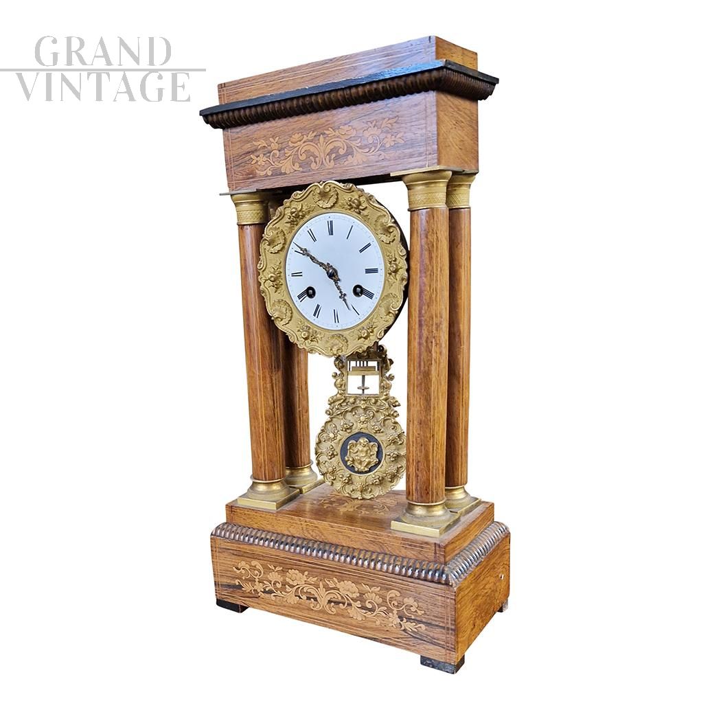 Orologio Impero da portale in noce intarsiato, metà XIX secolo