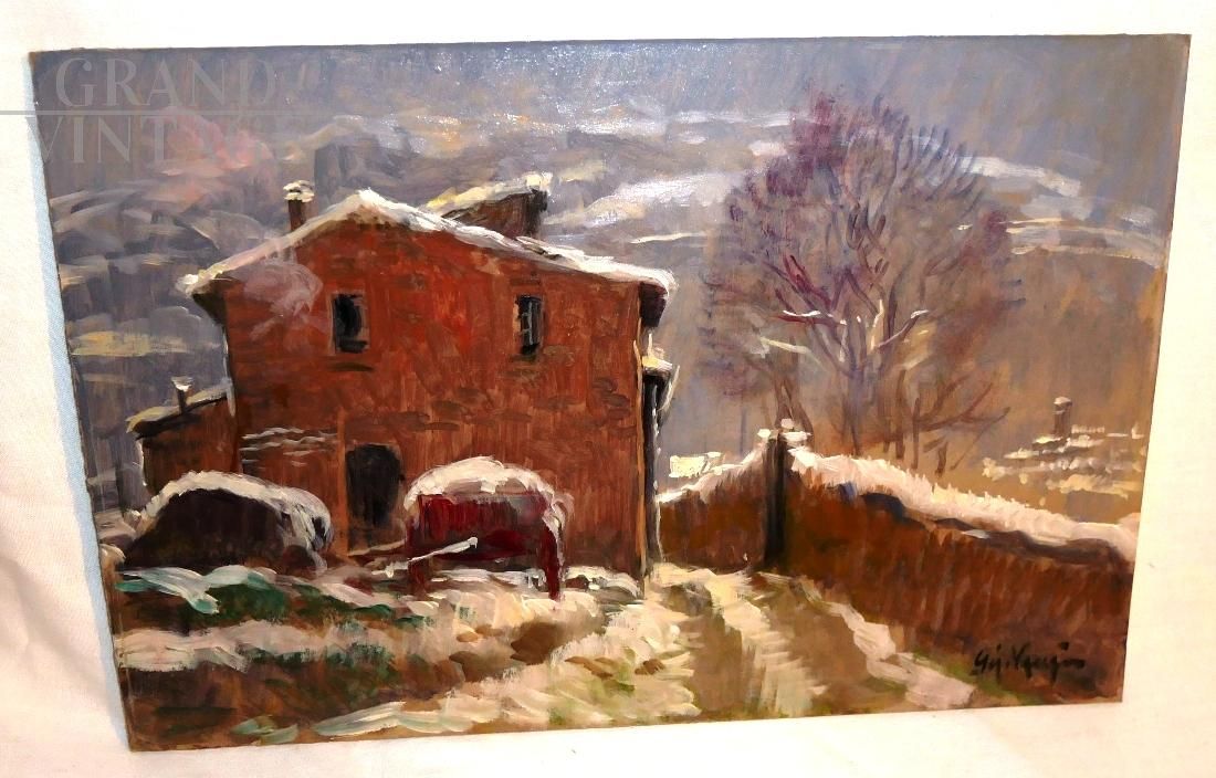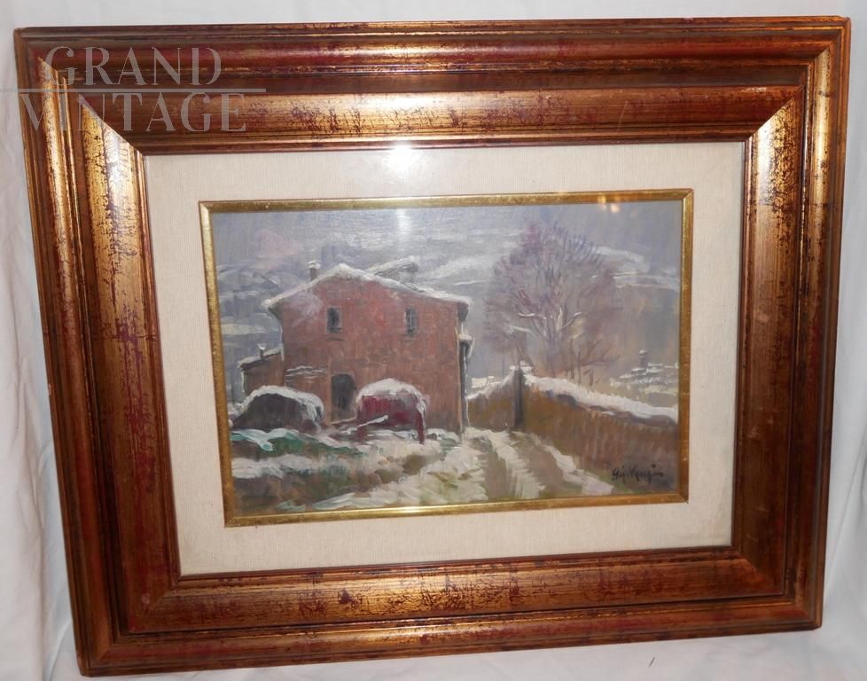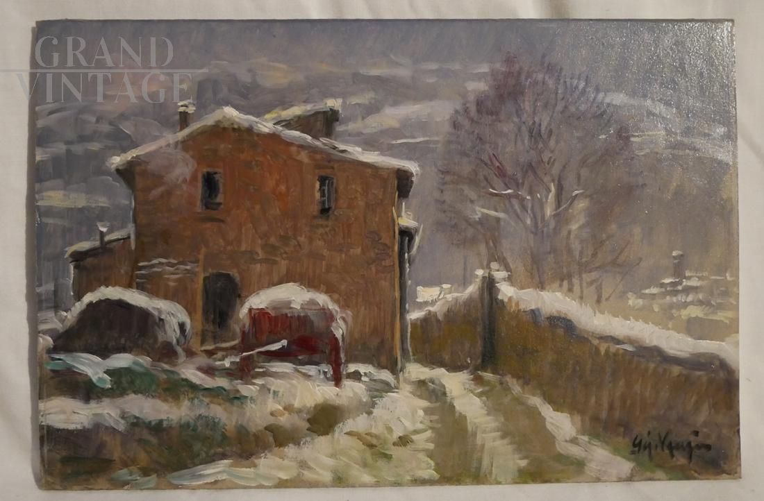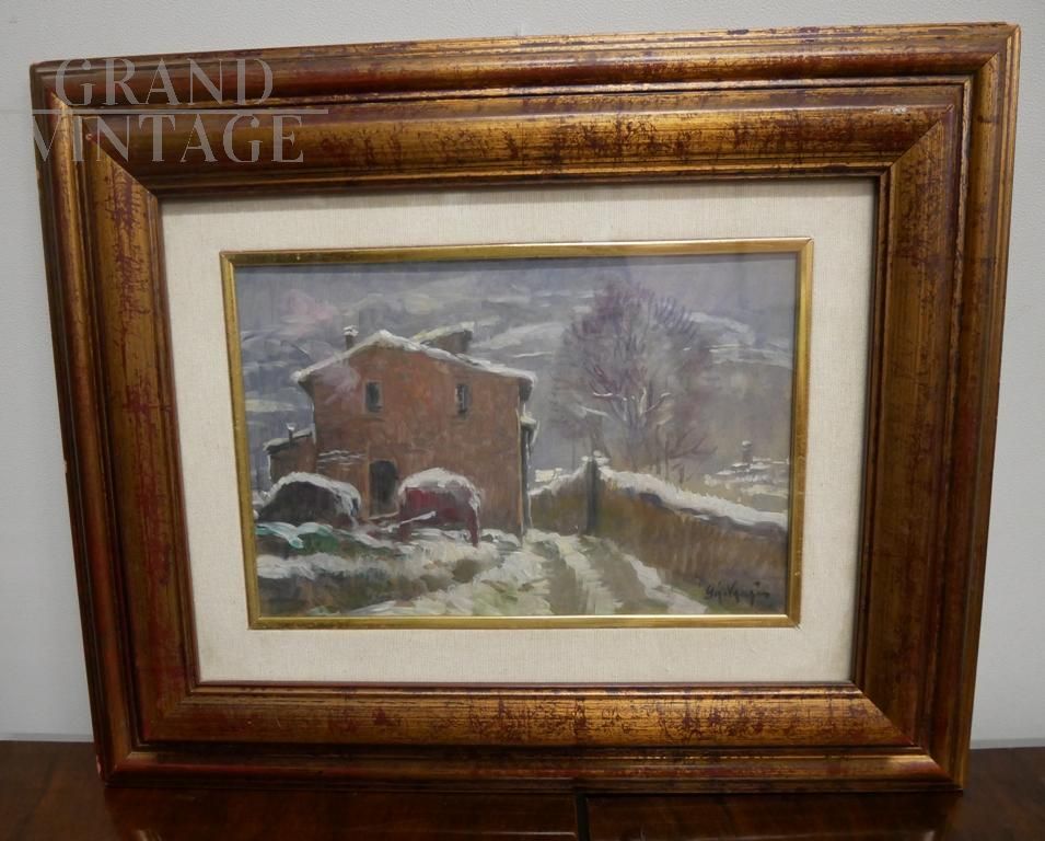 Paesaggio innevato, dipinto ad olio su cartoncino del XX secolo, firmato