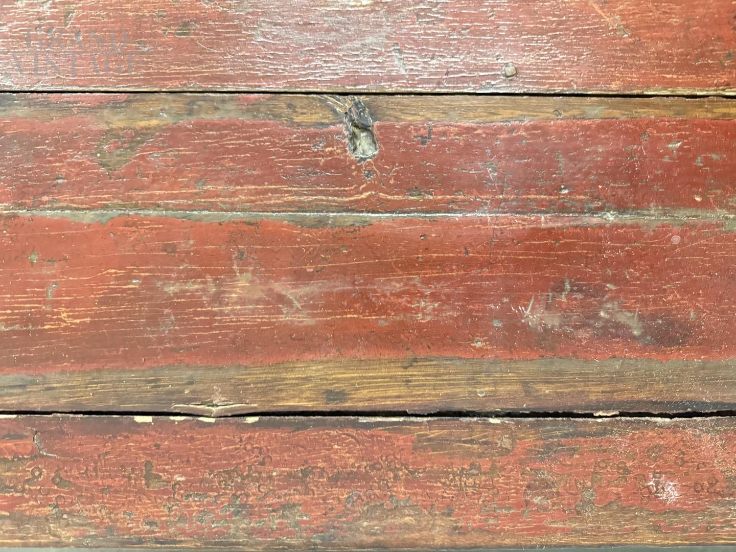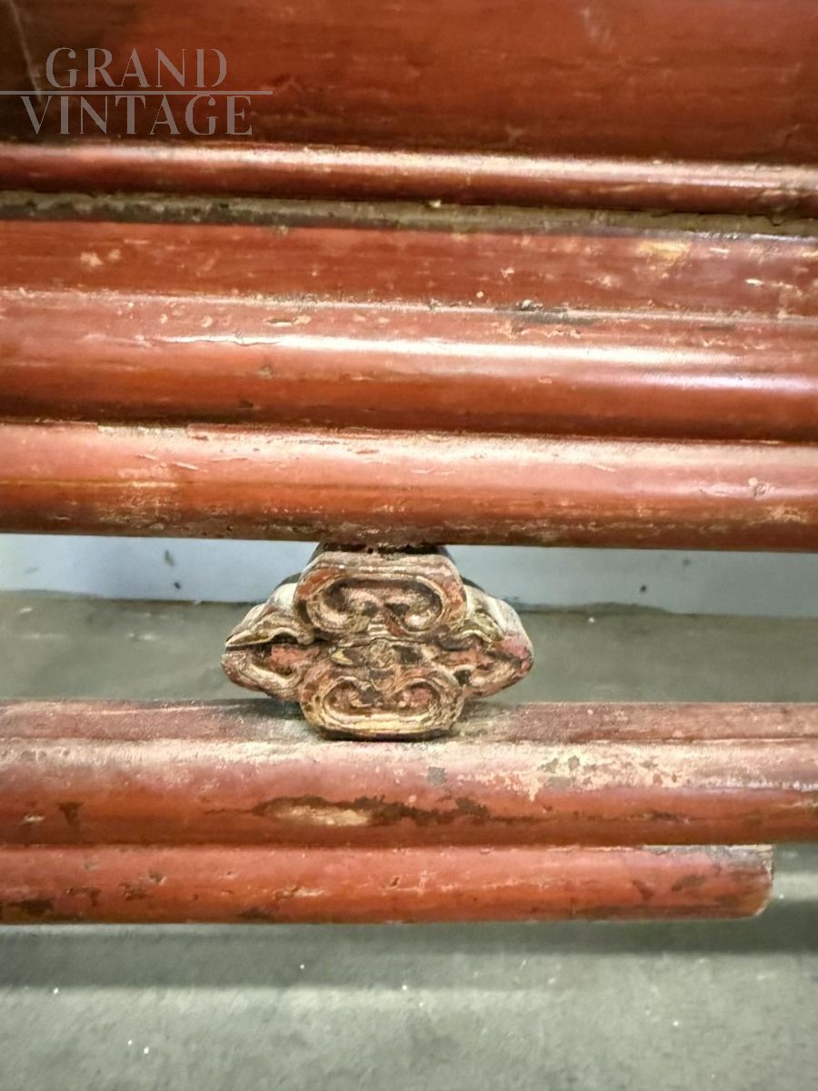 Panca cinese dei primi del '900 in legno effetto bamboo in pittura rossa, con i naturali segni di usura, in stato molto buono.