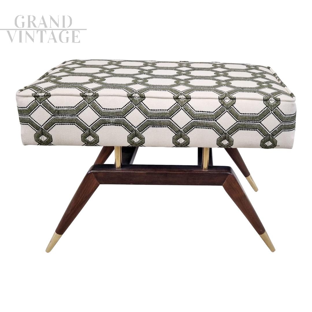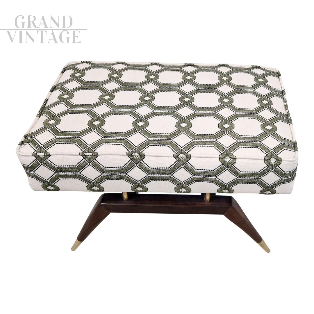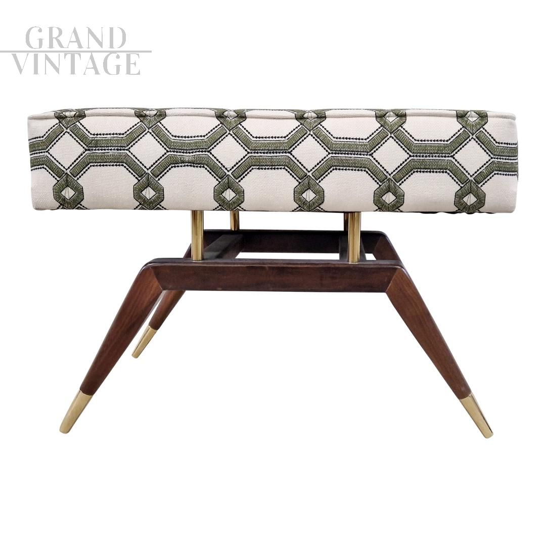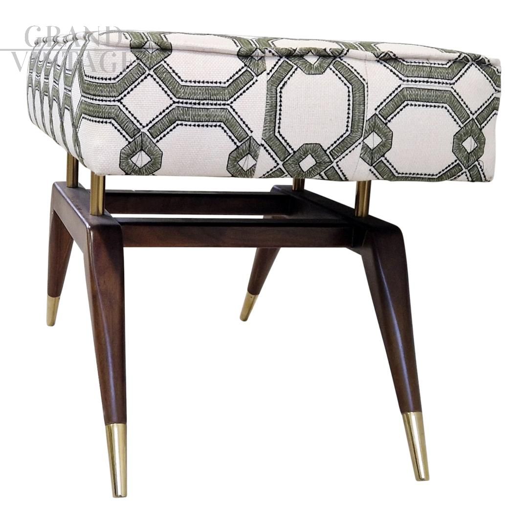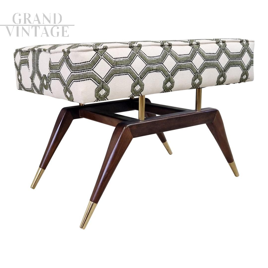 Panca da finestra in mogano scolpito e ottone, ispirata a Gio Ponti, il famoso designer italiano della metà del secolo scorso. Il cuscino fluttuante imbottito e rivestito in tessuto bianco con motivo geometrico verde, si appoggia su pilastri in ottone massiccio e pende su una stretta cornice.