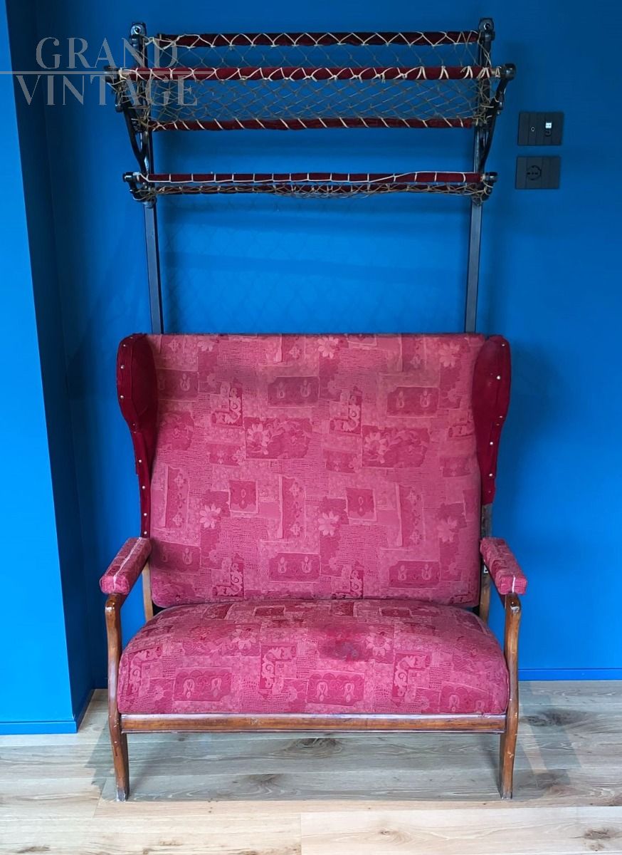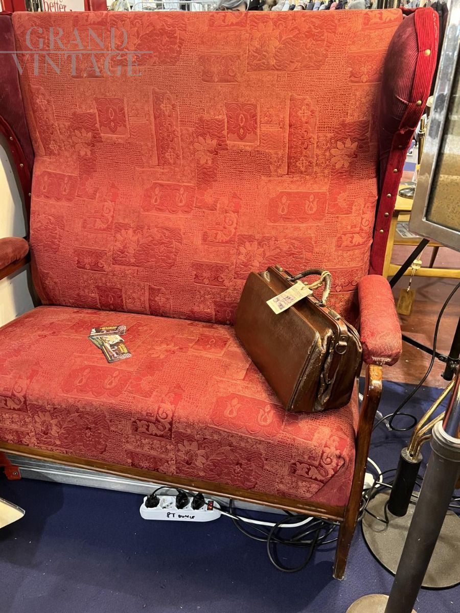 Divanetto panca da due posti proveniente dalla carrozza di un treno dei primi del '900, rivestita nel suo tessuto originale broccato rosso bordeaux, sui lati è rivestita in velluto a coste cordurouy rosso. La struttura in ferro nero sostiene la rastrelliera superiore con due scomparti rivestiti con velluto sui tubolari e a supporto delle valigie, in rete.