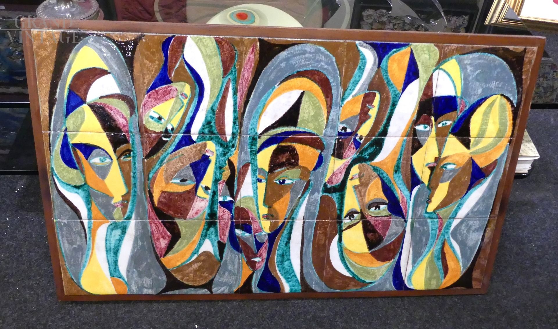 Pannello mosaico piastrellato con figure dipinte in stile cubista, bellissima opera d'arte, senza firma.