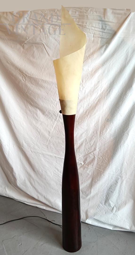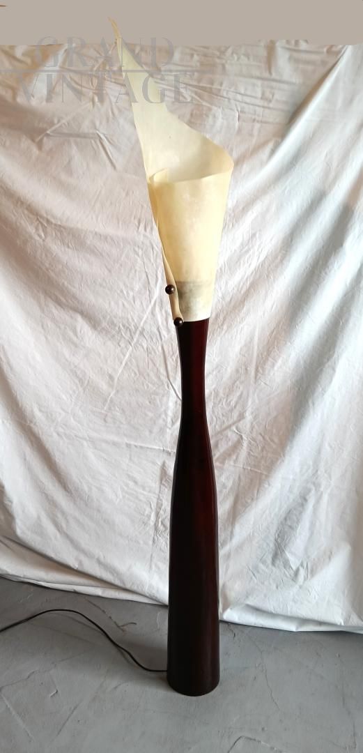 Lampada a stelo anni '70 con struttura in legno tinto massiccio e diffusore in pergamena resinata. La base è pesante e stabile, realizzata dal pieno. Il diffusore è in pergamena resinata, smontabile e lavabile. La lampada è stata ricablata con attacco lampadina E27, interruttore sul filo. Il tipo di struttura lignea a rocchetto ricorda il gioco del Diabolo. Verrà spedita con la parte in pergamena smontata dalla base, per ragioni di sicurezza, ma è facilmente rimontabile.