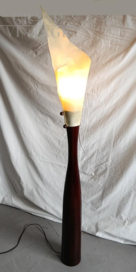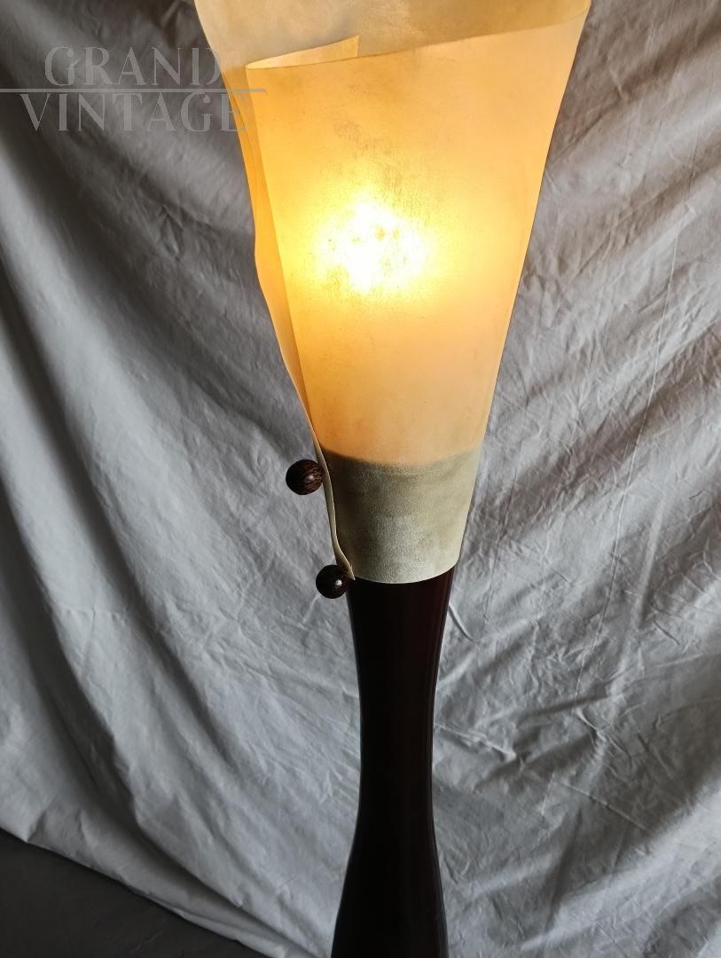 Piantana in legno tinto con paralume in pergamena, anni '70