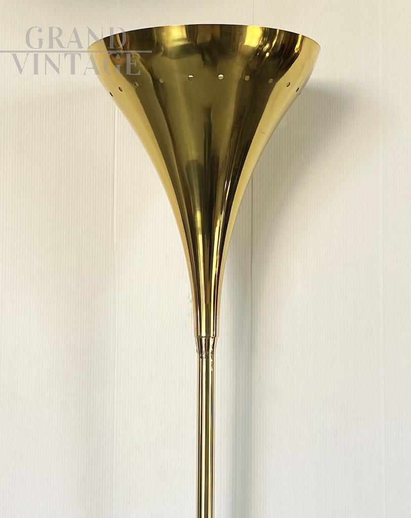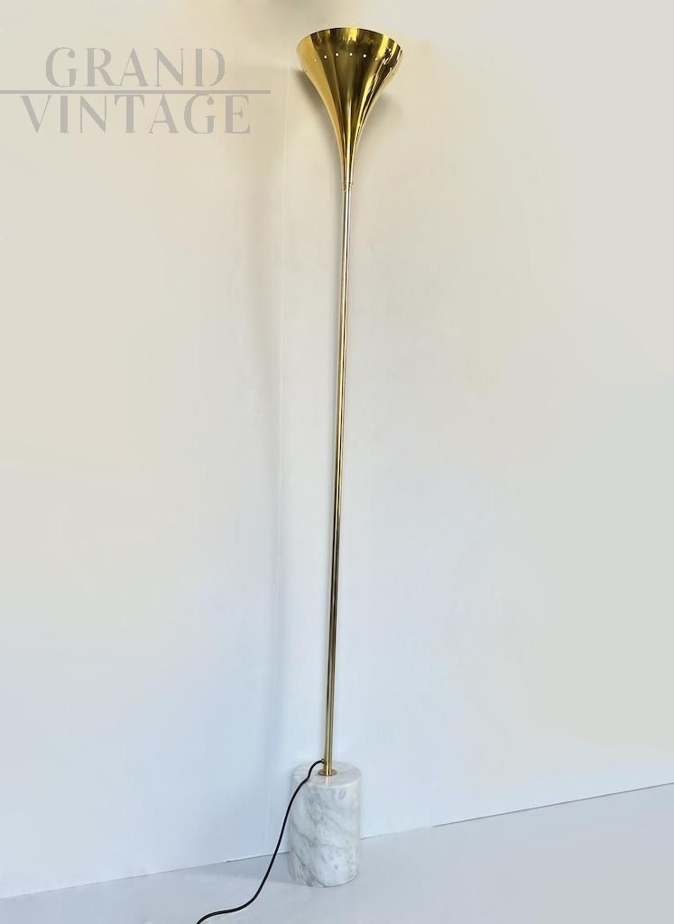 Elegante piantana vintage anni '70 interamente in ottone dorato con base in marmo bianco, di provenienza italiana.