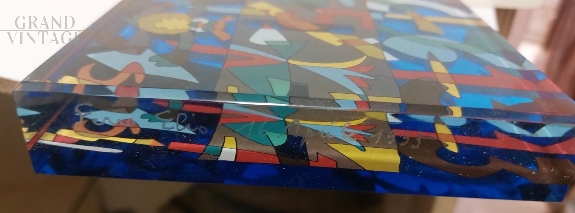 Meravigliosa opera d'arte a piastra in vetro di Murano multicolore con serigrafia di Ugo Nespolo, realizzato per la vetreria Elio Ferro, firmata sul bordo sinistro "ferro Elio 16 aprile 1993".