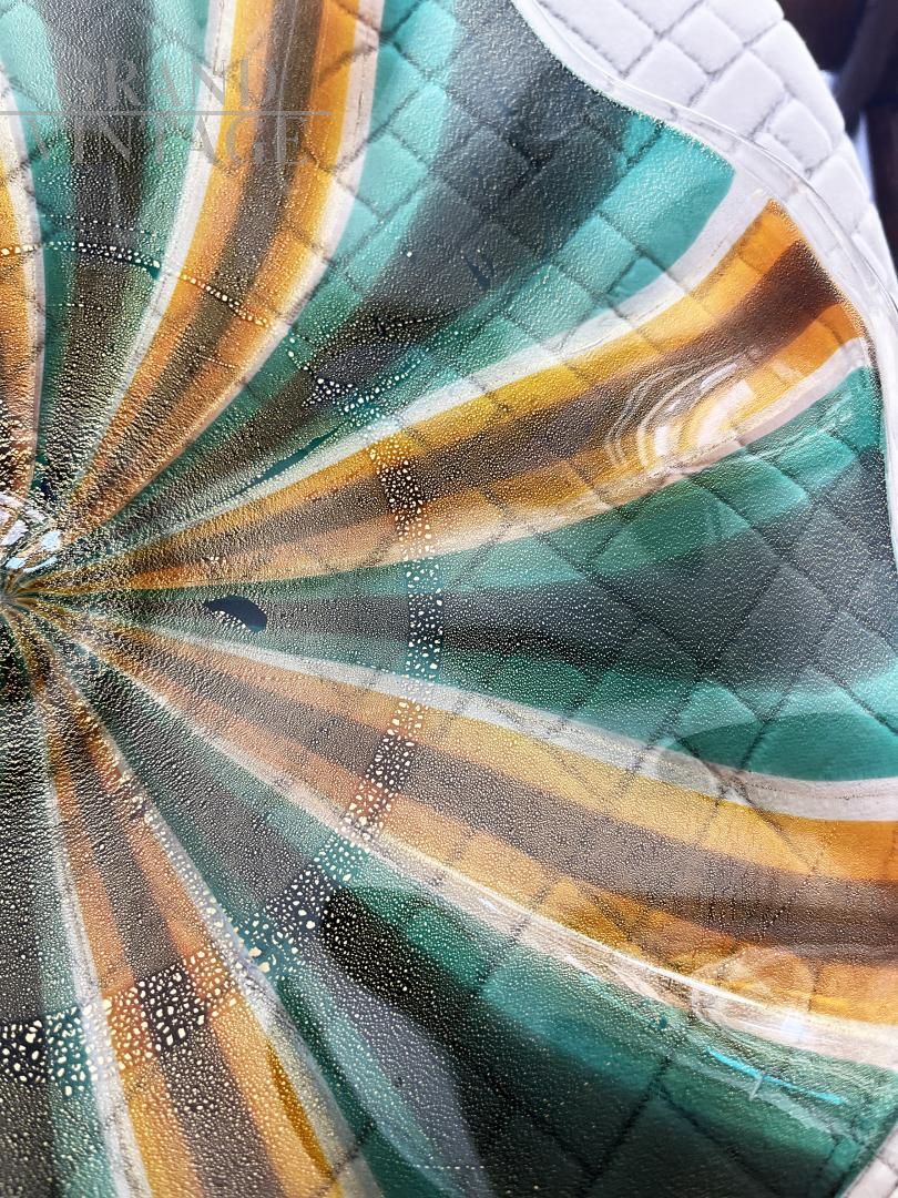 Piatto centrotavola rotondo in vetro di Murano cordonato d'oro. Si presenta in condizioni ottime, senza difetti. Bellissimi gli effetti dei colori presenti con inserito l'oro. Effetto diverso fronte e retro, vedi foto. Supporto non compreso.