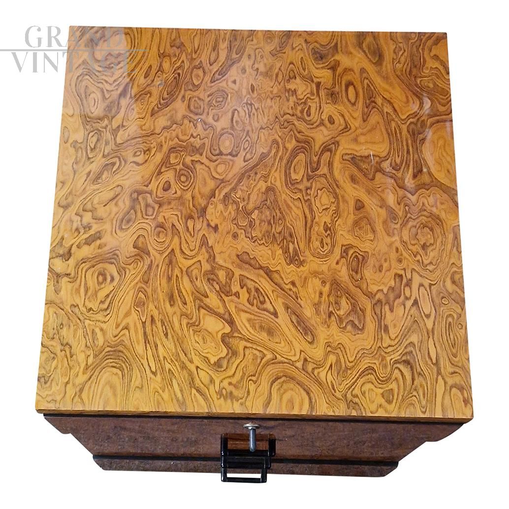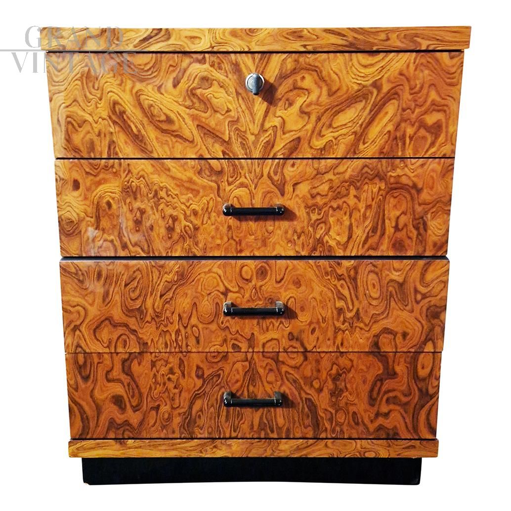 Piccola cassettiera art déco rifinita in radica di thuja, realizzata nella metà del XX secolo, dotata di quattro cassetti di cui quello superiore con chiave, poggia su uno zoccolo laccato nero.