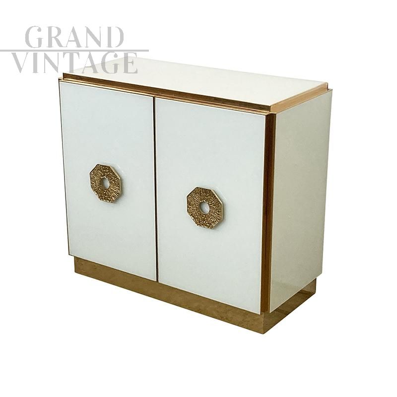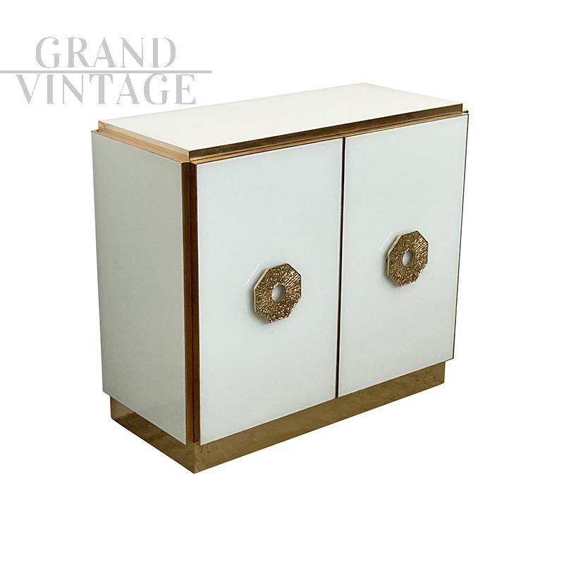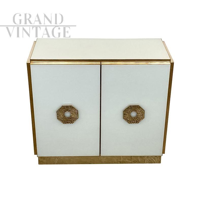 Credenza design vintage a due ante, interamente realizzata a mano, con struttura in legno e finiture superficiali in vetro di Murano bianco; profili, maniglie e zoccolo in ottone dorato.