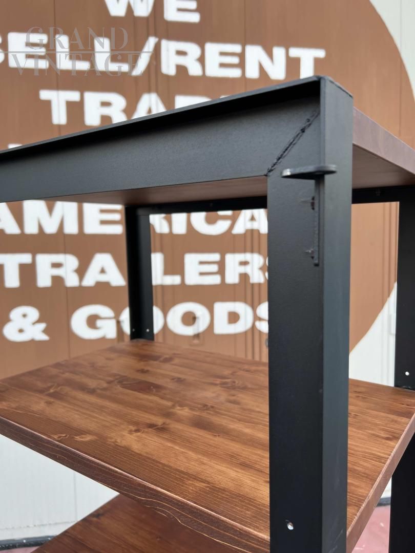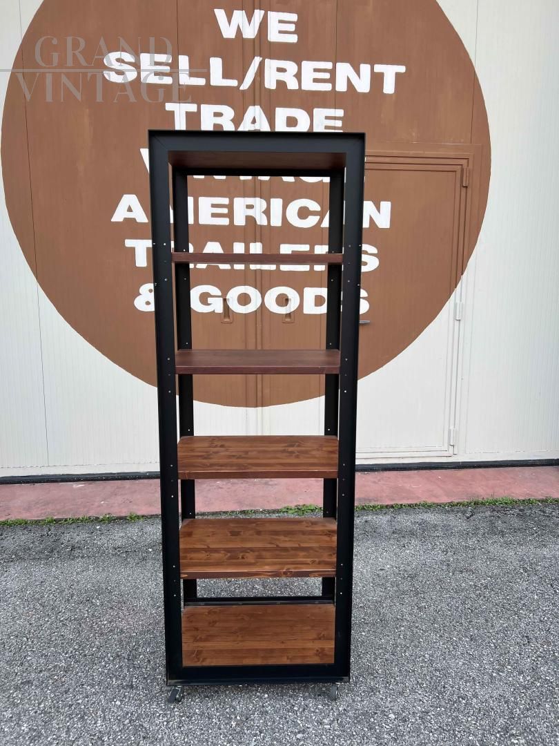 Libreria a giorno o scaffale industriale in ferro con 6 ripiani in legno, attrezzato con ruote che ne facilitano lo spostamento, è perfetto per un ambiente industriale, un negozio o un'officina.