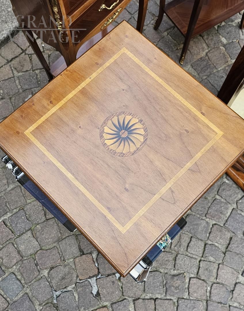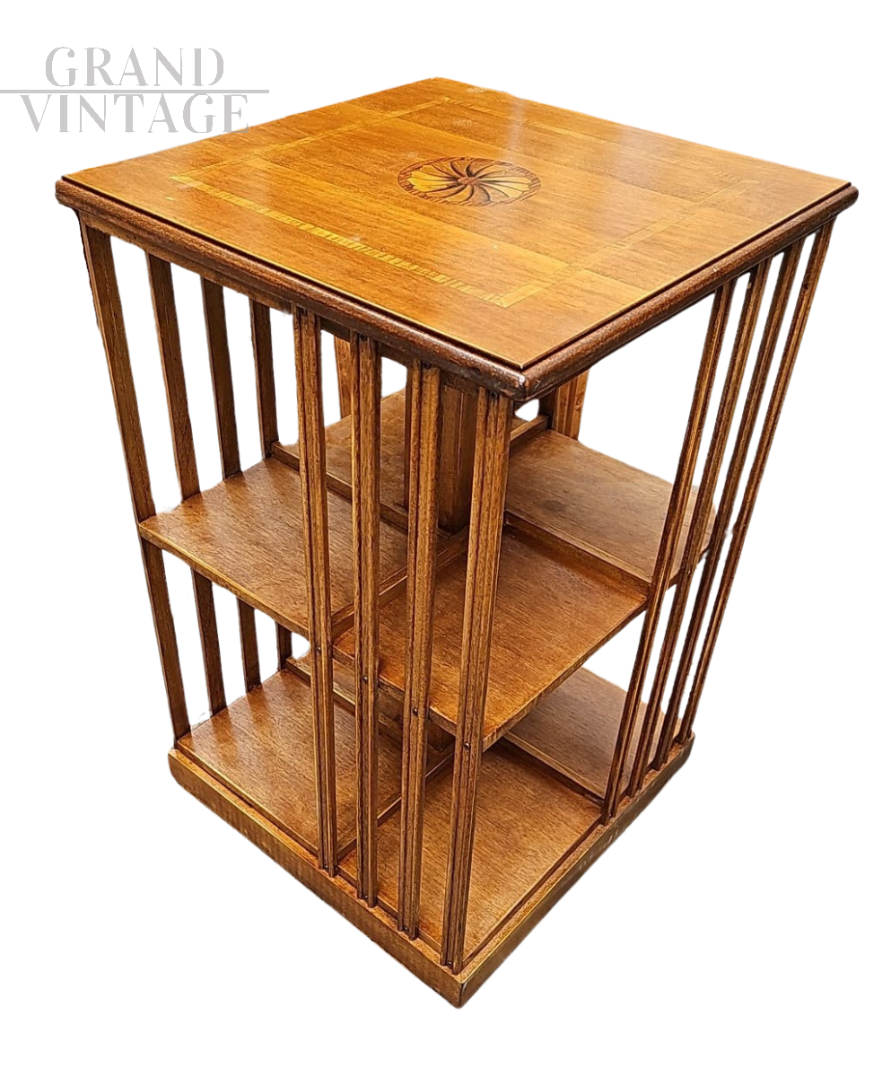 Piccola libreria girevole revolver inglese utilizzabile anche come tavolino, realizzata in noce con i filetti di bosso e palissandro e un bell'intarsio sul piano. Questa libreria contiene circa quaranta - cinquanta libri!
