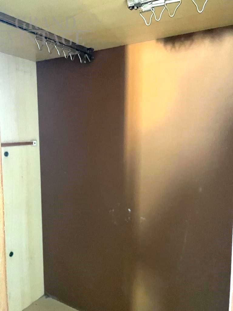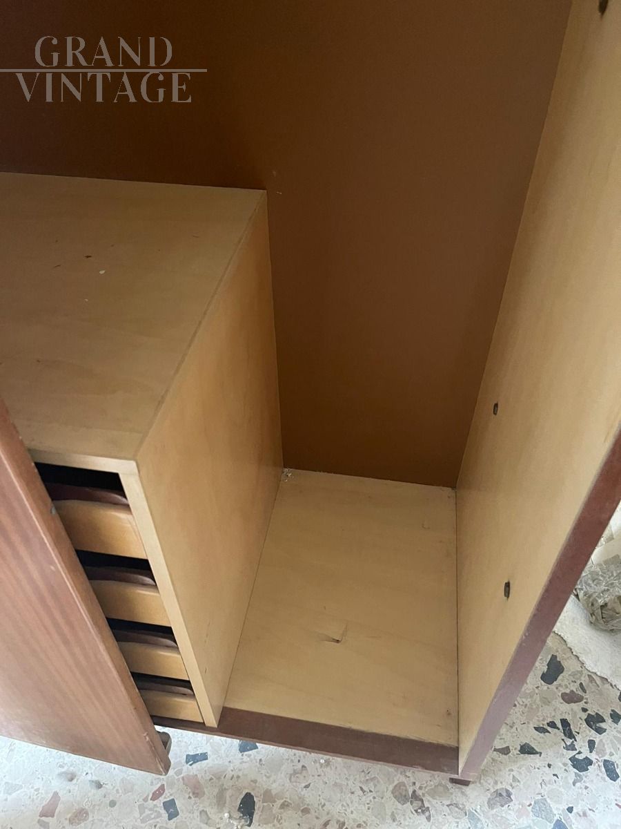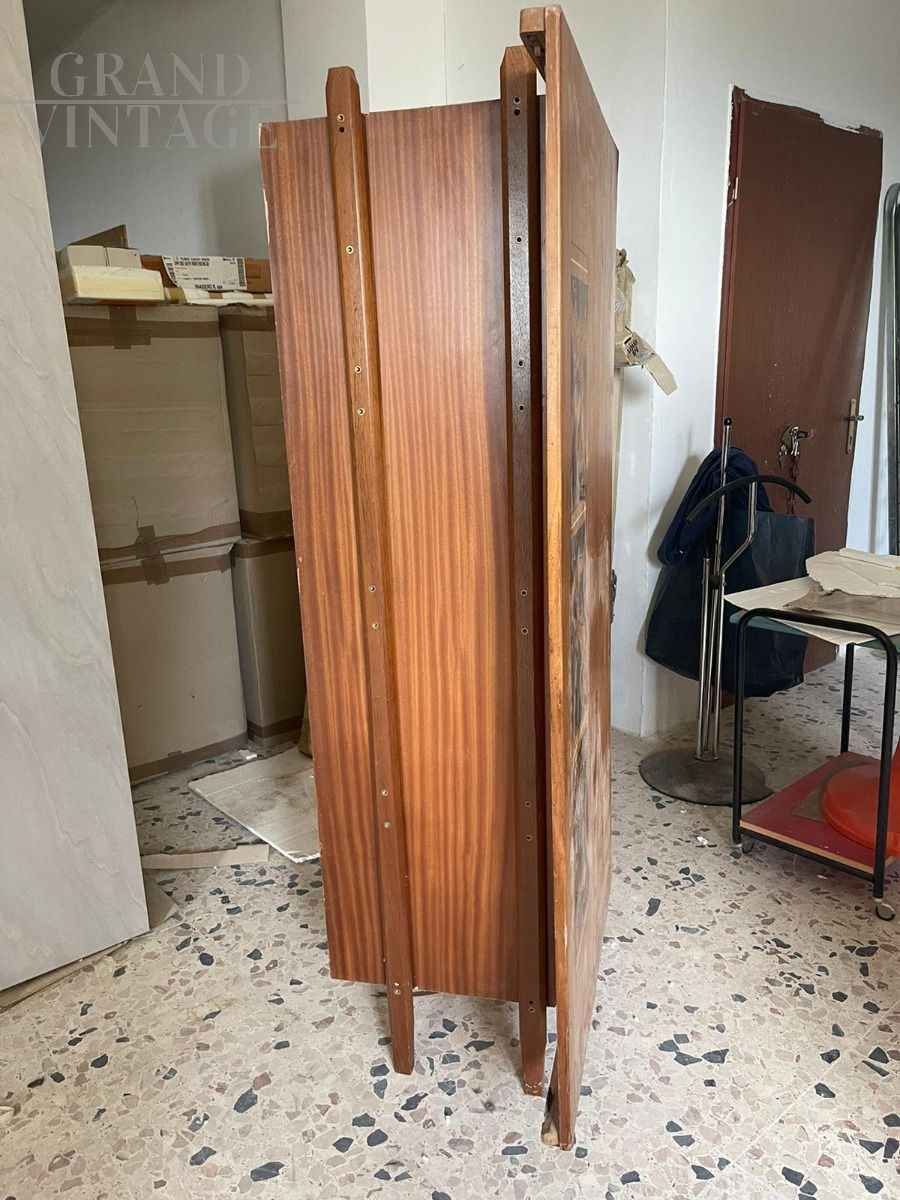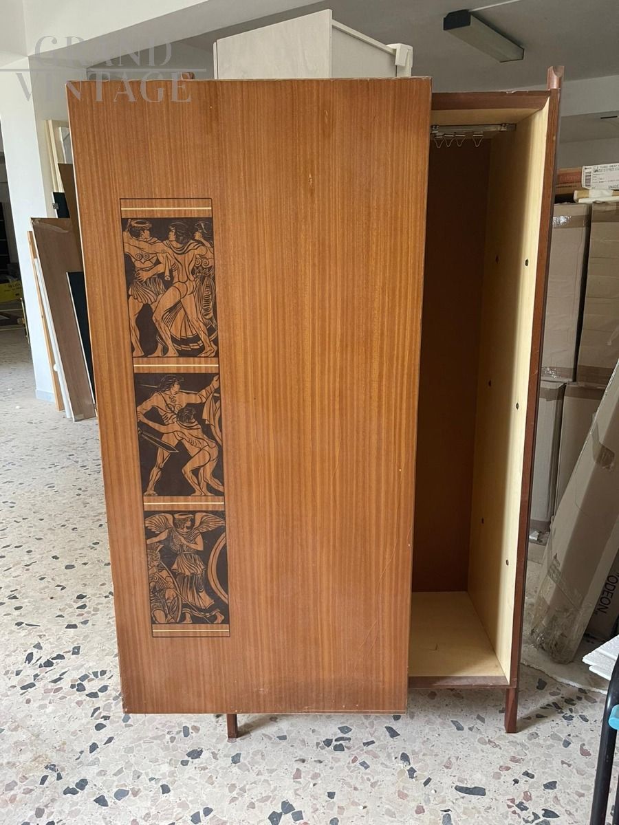 Piccolo armadio da ingresso vintage anni '50 a un'anta scorrevole, in legno di palissandro, decorato sul fronte da figure in stile Antica Grecia. All'interno una comoda cassettiera e diversi ganci grucce appendiabiti.