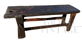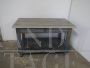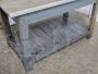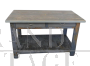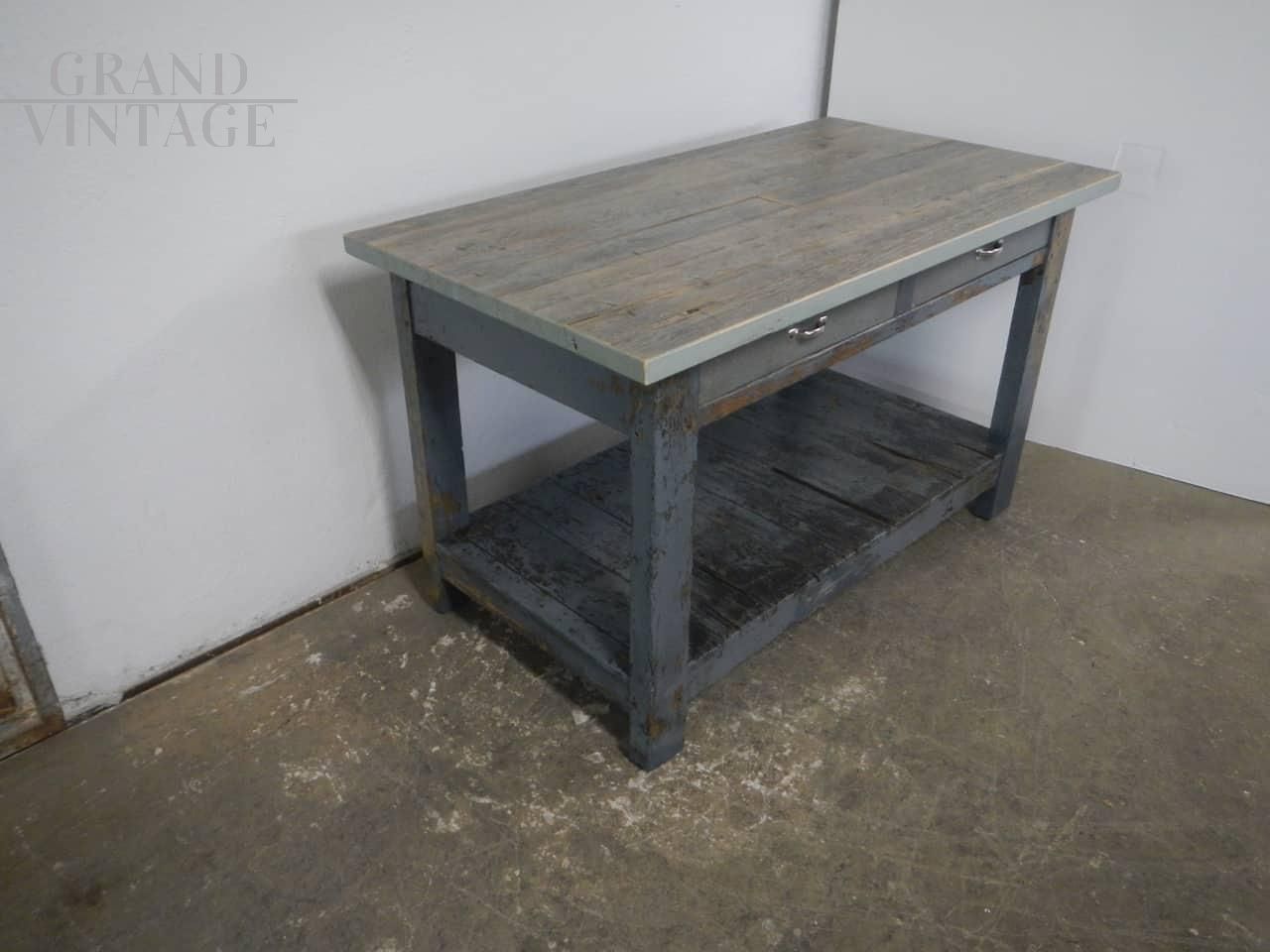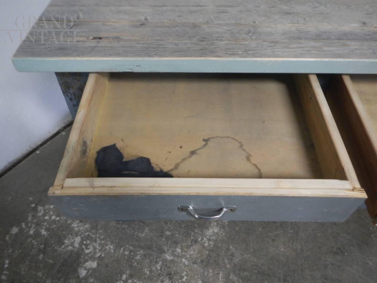 Piccolo bancone da negozio o da lavoro vintage industriale in legno di abete in pittura grigia, dotato di due cassetti di 52 x 46 x h 7 cm e di un sotto piano, restaurato con sostituzione piano e realizzazione cassetti. Lo spazio inferiore ha un'altezza di 47 cm.