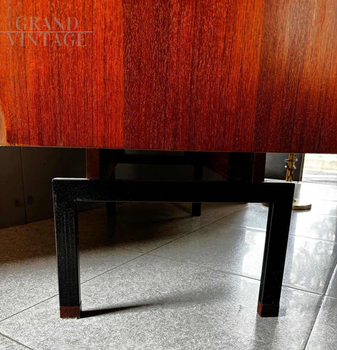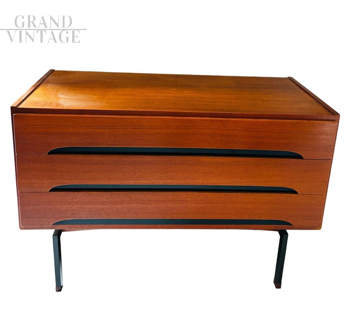 Piccolo comò cassettiera vintage italiana in legno teak con gambe in ferro, dal bellissimo stile scandinavo degli anni '60. In ottime condizioni, presenta normali segni di usura compatibili con l’epoca e una piccola stuccatura nello spigolo in basso del fianco sinistro, come da foto.