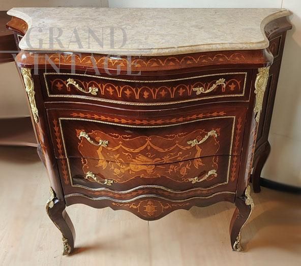 Piccolo comò commode in stile antico Luigi XIV con 3 cassetti della seconda metà del '900. Il mobile è realizzato in legno di faggio con una bella linea mossa, frontali lastronati in legni di mogano e noce con intarsi in acero e profili e decorazioni in bronzate sui cassetti. Pianale in marmo sagomato, piedi sagomati con decori bronzati applicati. Mobile in perfetto stato conservativo, finiture patinate originali, lucidato.