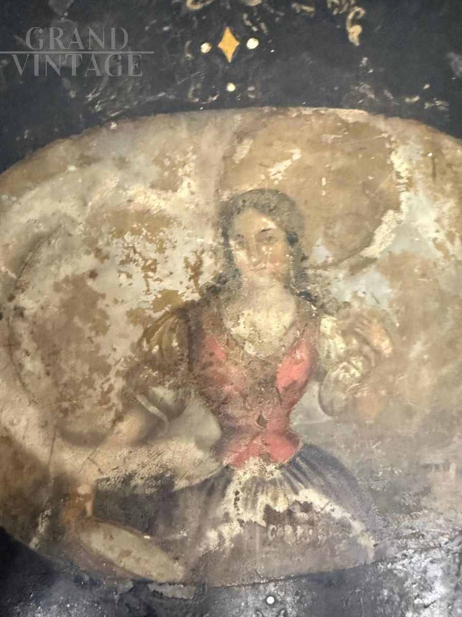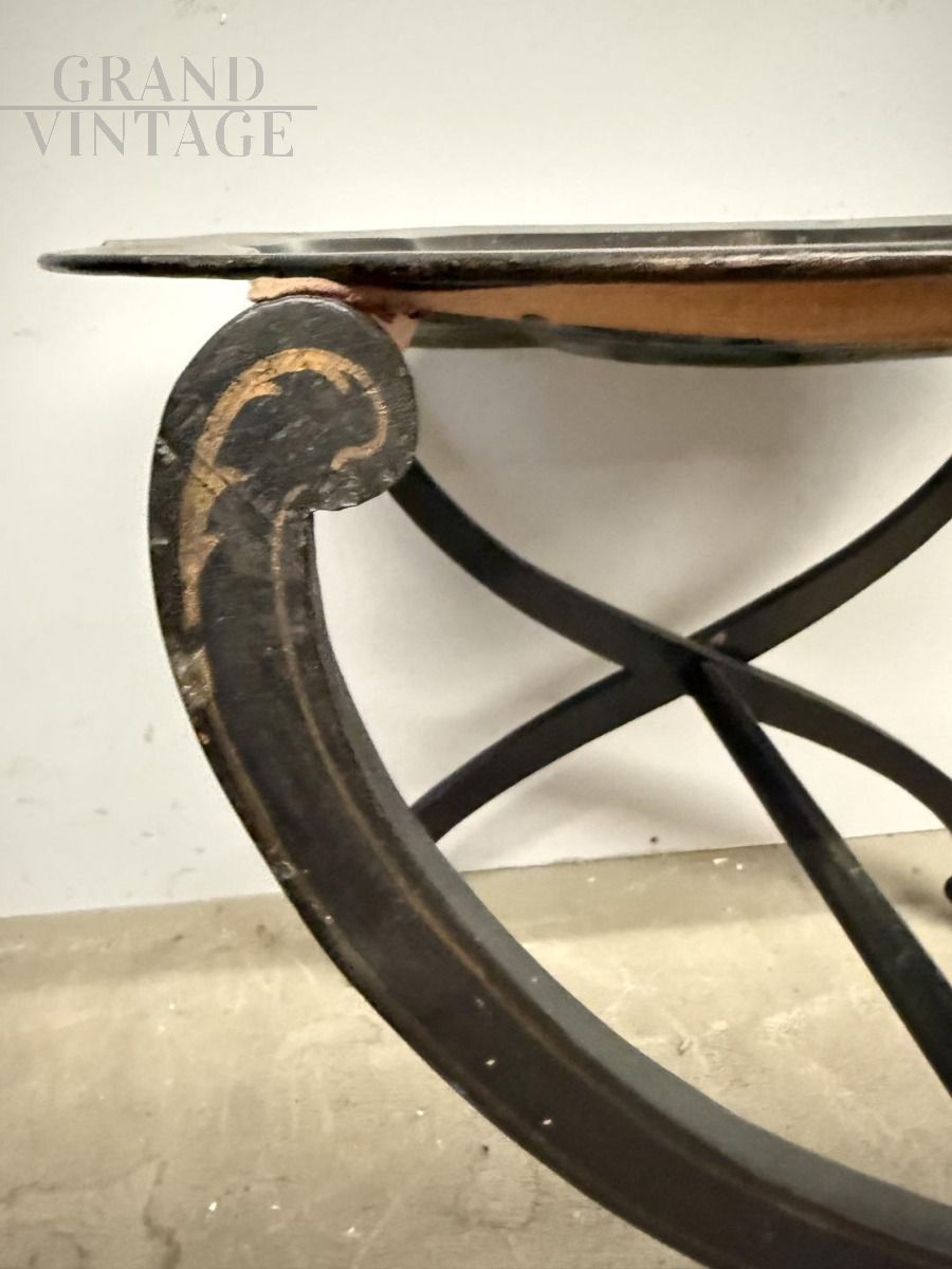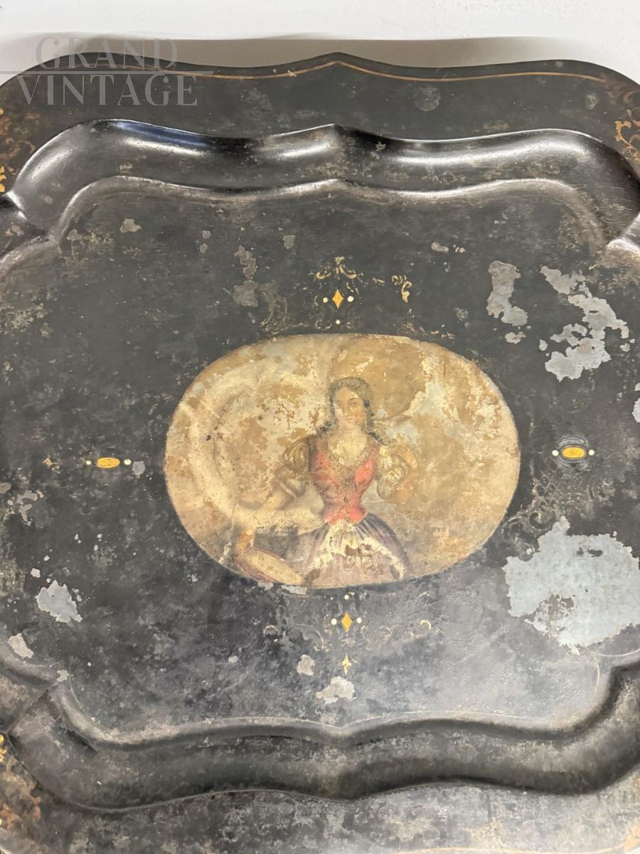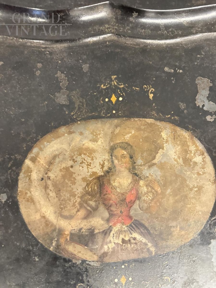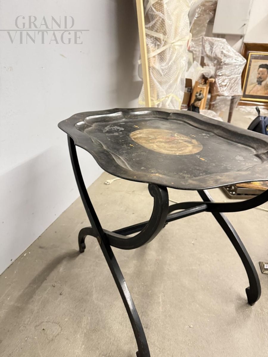Piccolo tavolino da picnic richiudibile antico del 1850 in legno laccato nero con inserti dorati, il piano è a vassoio dall'elegante forma mossa ed è arricchito da un dipinto di scena classica sul piano, 52 x 56 x 64cm.