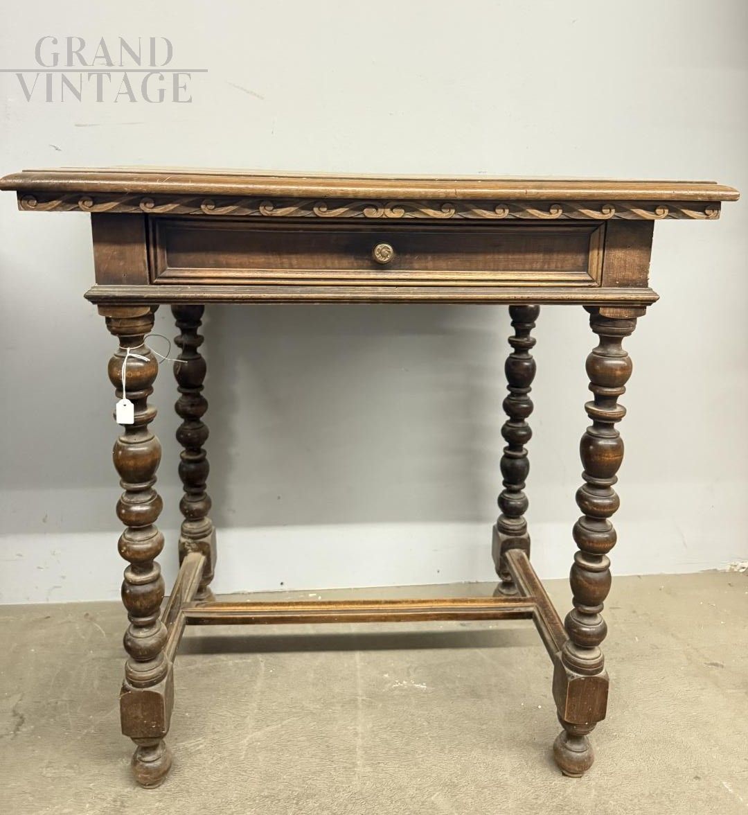 Tavolinetto piccolo scrittoio o tavolino da appoggio antico del '800 in noce massello con gambe tornite, sottopiano intagliato e cassetto centrale, in patina, da restaurare. 75 x 80 x 50 cm.
