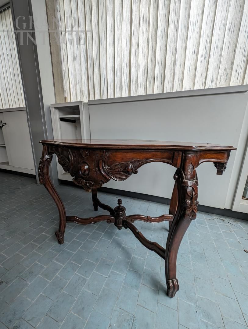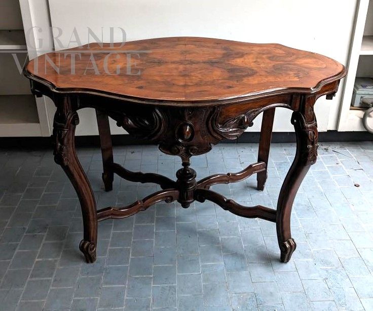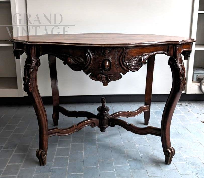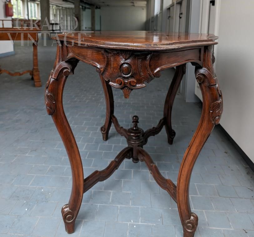 Piccolo tavolo antico a biscotto in noce intagliato primi '800