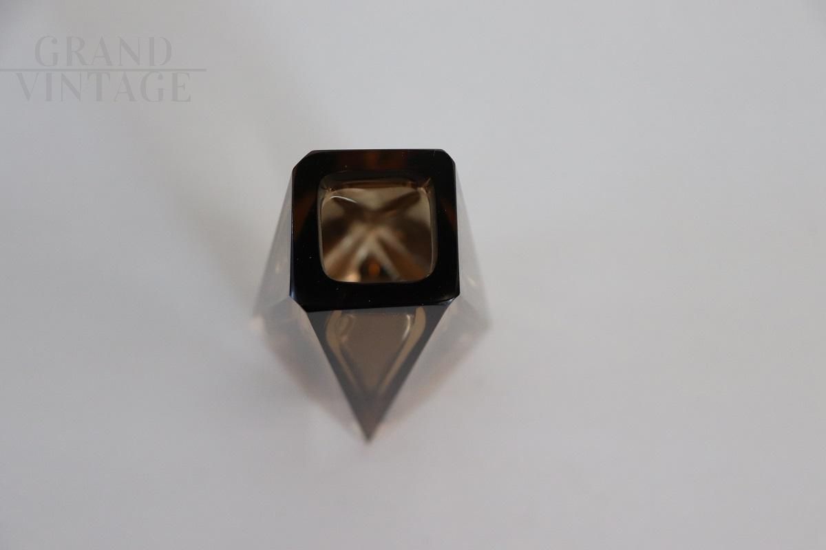 Bellissimo piccolo vaso di Mandruzzato in vetro di Murano spesso e sfaccettato color ambra fumé, modernariato italiano anni '60. Questo piccolo vaso è un pezzo davvero affascinante e unico, tipico della tradizione artigianale di Mandruzzato. Negli anni '60, l'innovazione e l'attenzione per i dettagli erano al centro della produzione di questo studio, rendendo ogni pezzo non solo un oggetto decorativo, ma anche una vera opera d'arte. La forma è unica, con sfaccettature multiple, una specialità di Mandruzzato, noto per le sue forme geometriche e cubiche. Il vaso è in condizioni eccellenti, non presenta alcun marchio o firma, l'attribuzione basata sulla qualità del vetro e sul design. Ottimo come decorazione centrale, su un tavolo, in una libreria o in qualsiasi altro spazio. Prezzo trattabile.
