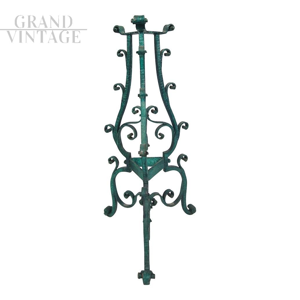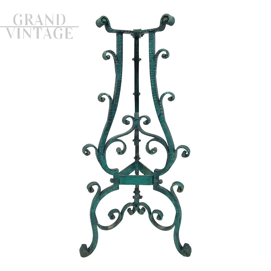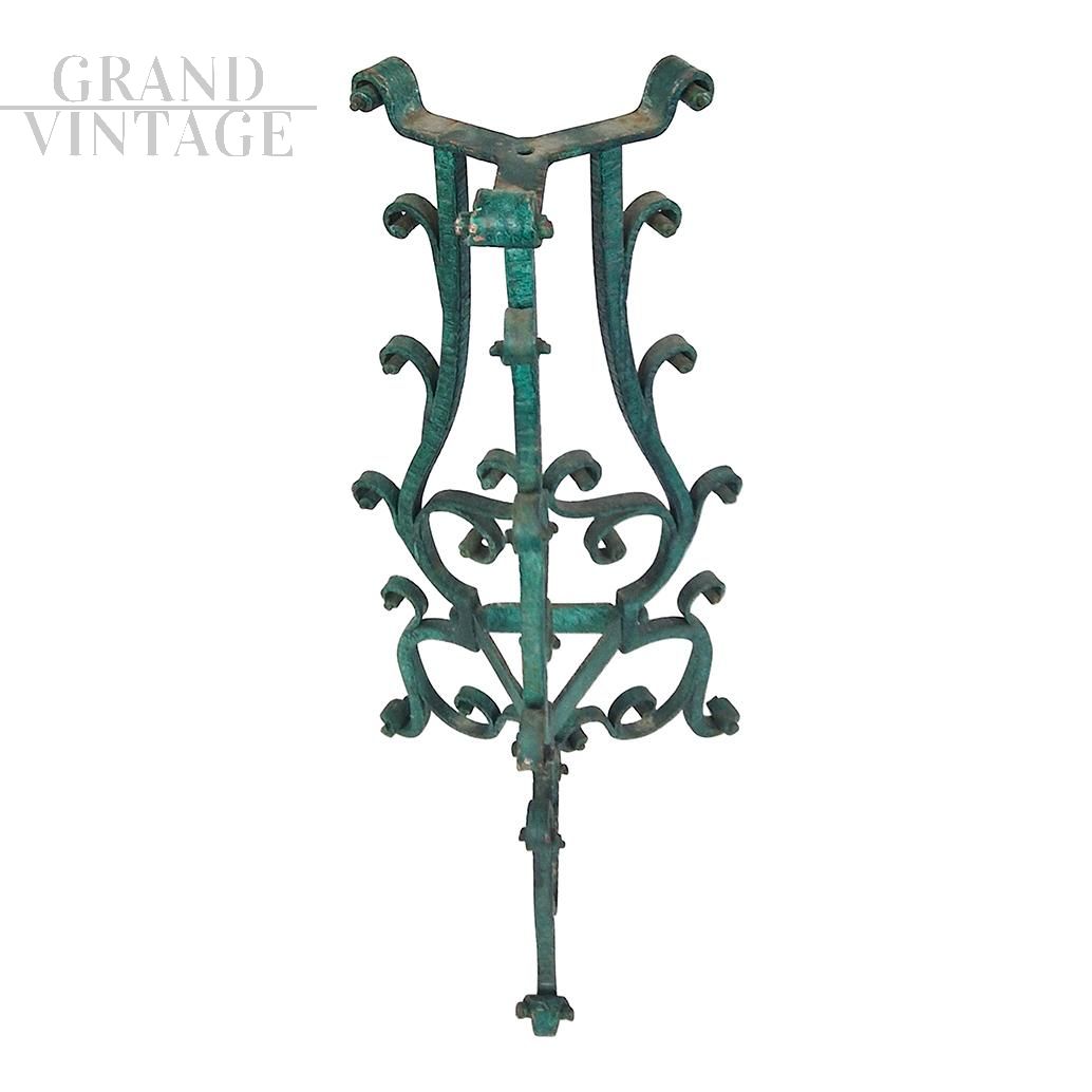 Trespolo piedistallo porta vaso in ferro battuto e forgiato a mano, manifattura Italiana di fine '800, ornato da ramages intrecciati ed elementi floreali, poggiante su treppiede.