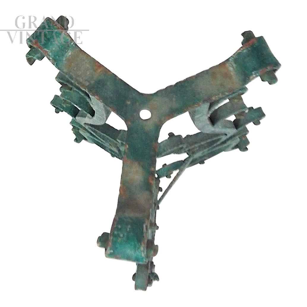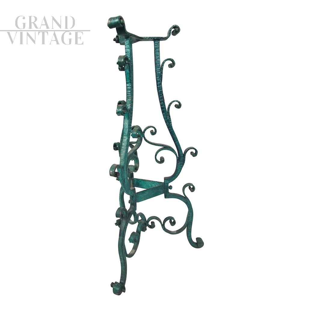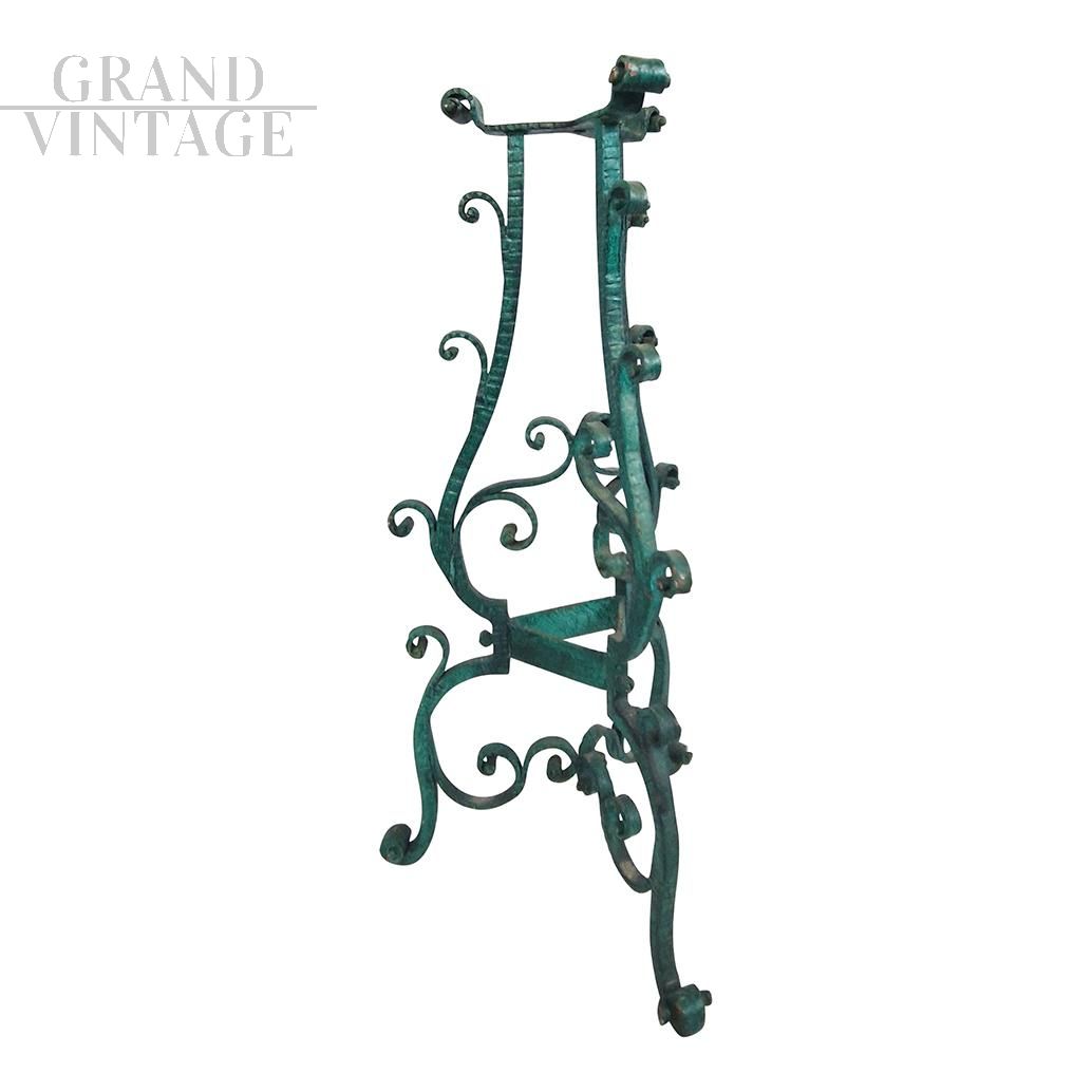 Trespolo piedistallo porta vaso in ferro battuto e forgiato a mano, manifattura Italiana di fine '800, ornato da ramages intrecciati ed elementi floreali, poggiante su treppiede.