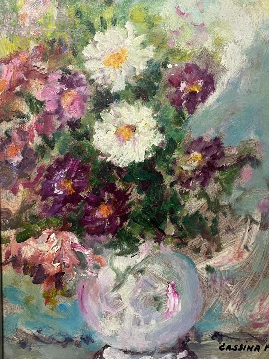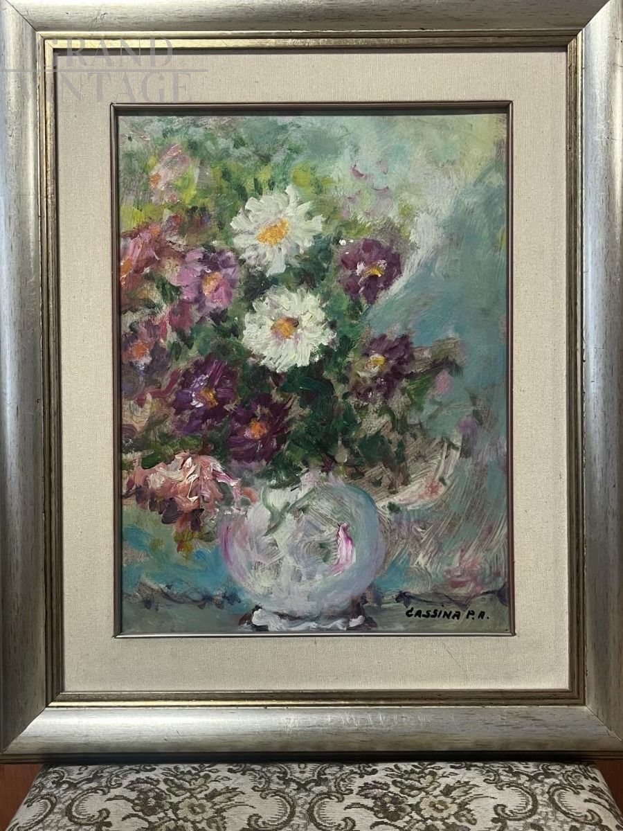 Dipinto realizzato ad olio su masonite dal celebre pittore torinese Pietro Augusto Cassina (1913-1999) raffigurante un vaso di fiori di svariati colori, un dipinto luminoso e di ottima fattura. Un'opera vibrante che ricalca lo stile impressionista di un artista considerato dalla critica “fuori dagli schemi del suo tempo”. Dipinto firmato a mano dall'artista in basso a destra, in ottime condizioni entro la sua originale cornice argentata.