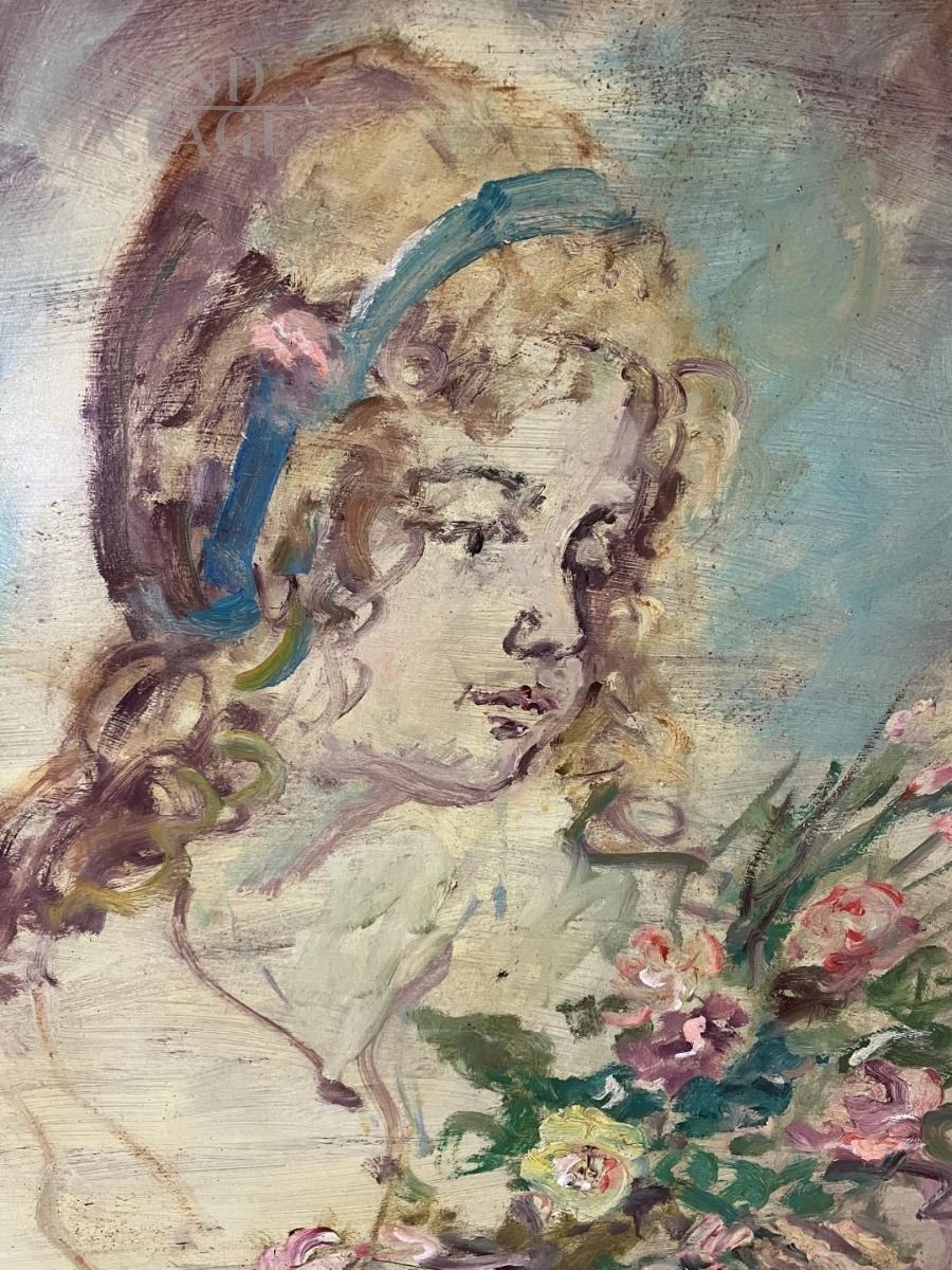 Dipinto realizzato negli anni ‘70 ad olio su masonite dal celebre pittore torinese Pietro Augusto Cassina (1913/1999), raffigurante una giovane donna dal viso innocente e spensierato, i lunghi capelli solcati da un cerchietto azzurro, un mazzo di fiori recisi stretti tra le mani. Un'opera vibrante che ricalca gli stili impressionisti di un artista considerato dalla critica come “fuori dagli schemi del tempo”. Dipinto firmato a mano dall’artista, privo di cornice.