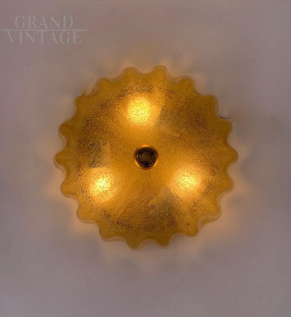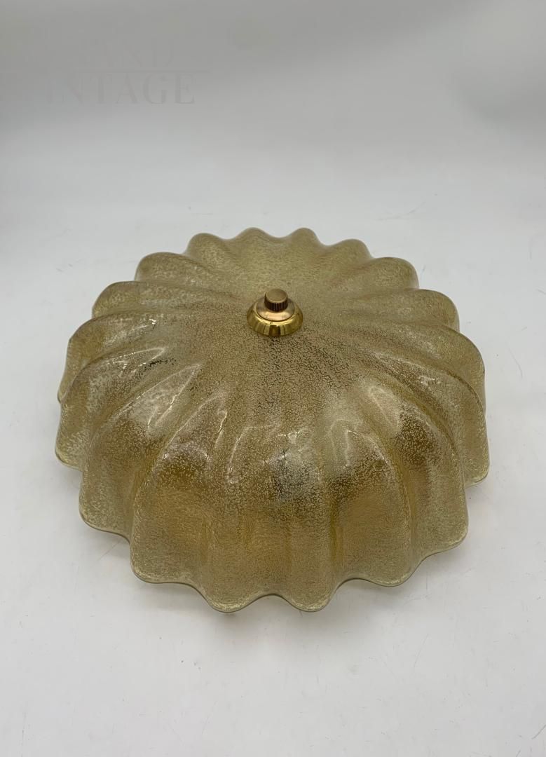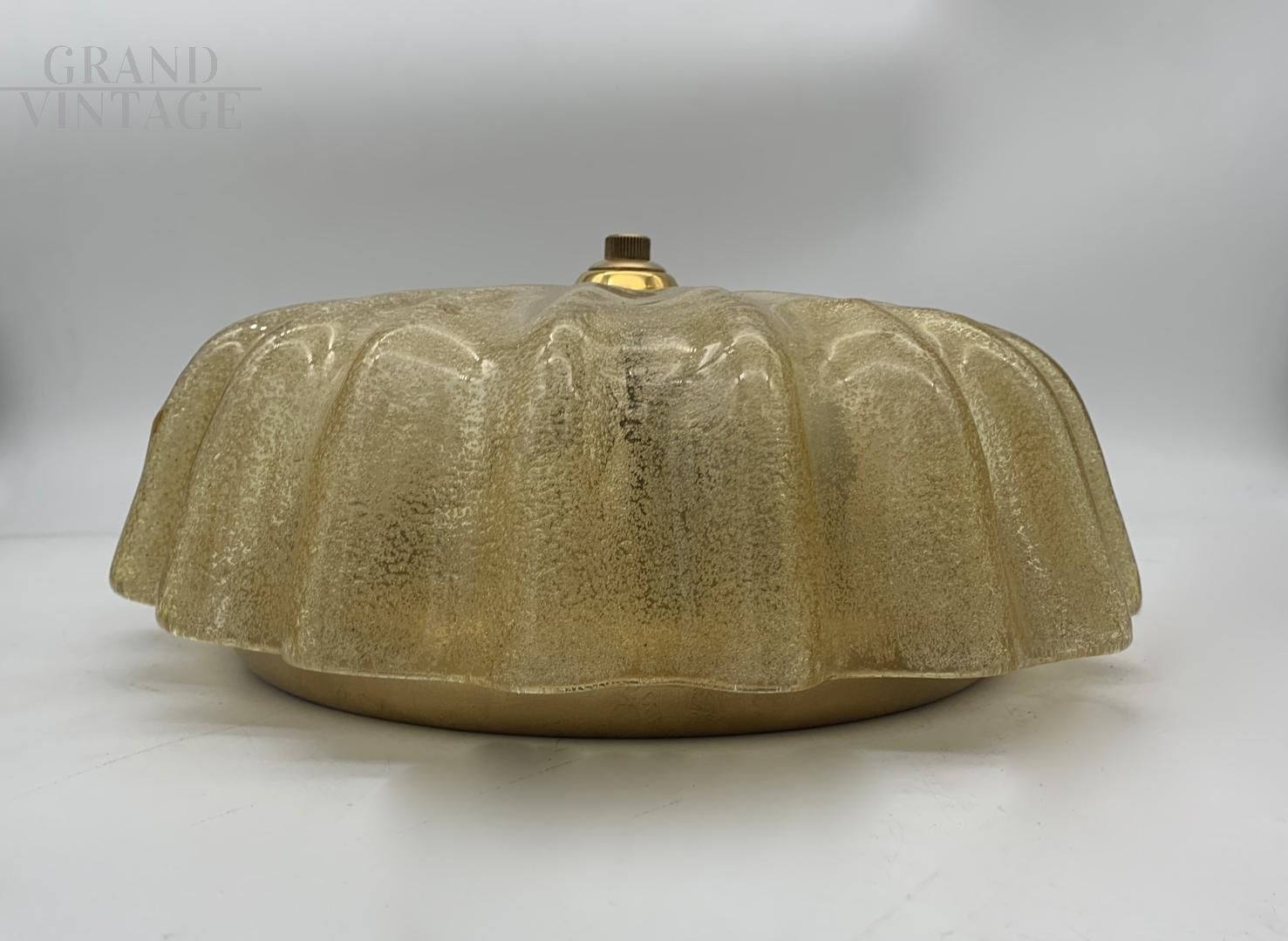 Elegante plafoniera vintage attribuita a Seguso in vetro di Murano color ocra scuro con lavorazione a graniglia di vetro all'interno, lavorato a mano su stampo e montato su una struttura in metallo con rifinitura esterna in ottone. Può esser utilizzata sia come plafoniera che come applique. All'interno ci sono 3 attacchi per lampadina di tipo E27 in ceramica. L'impianto elettrico è nuovo.