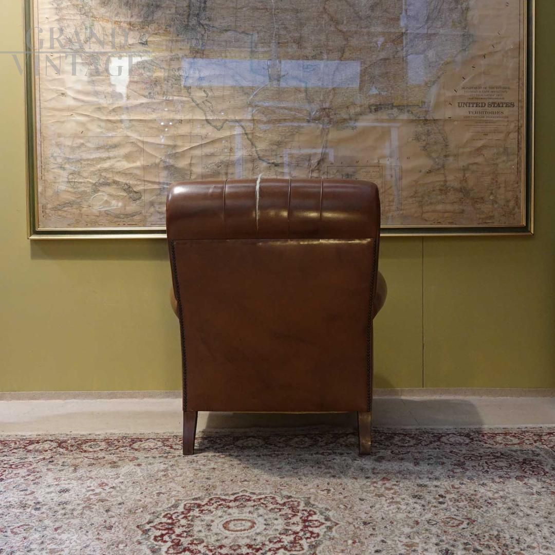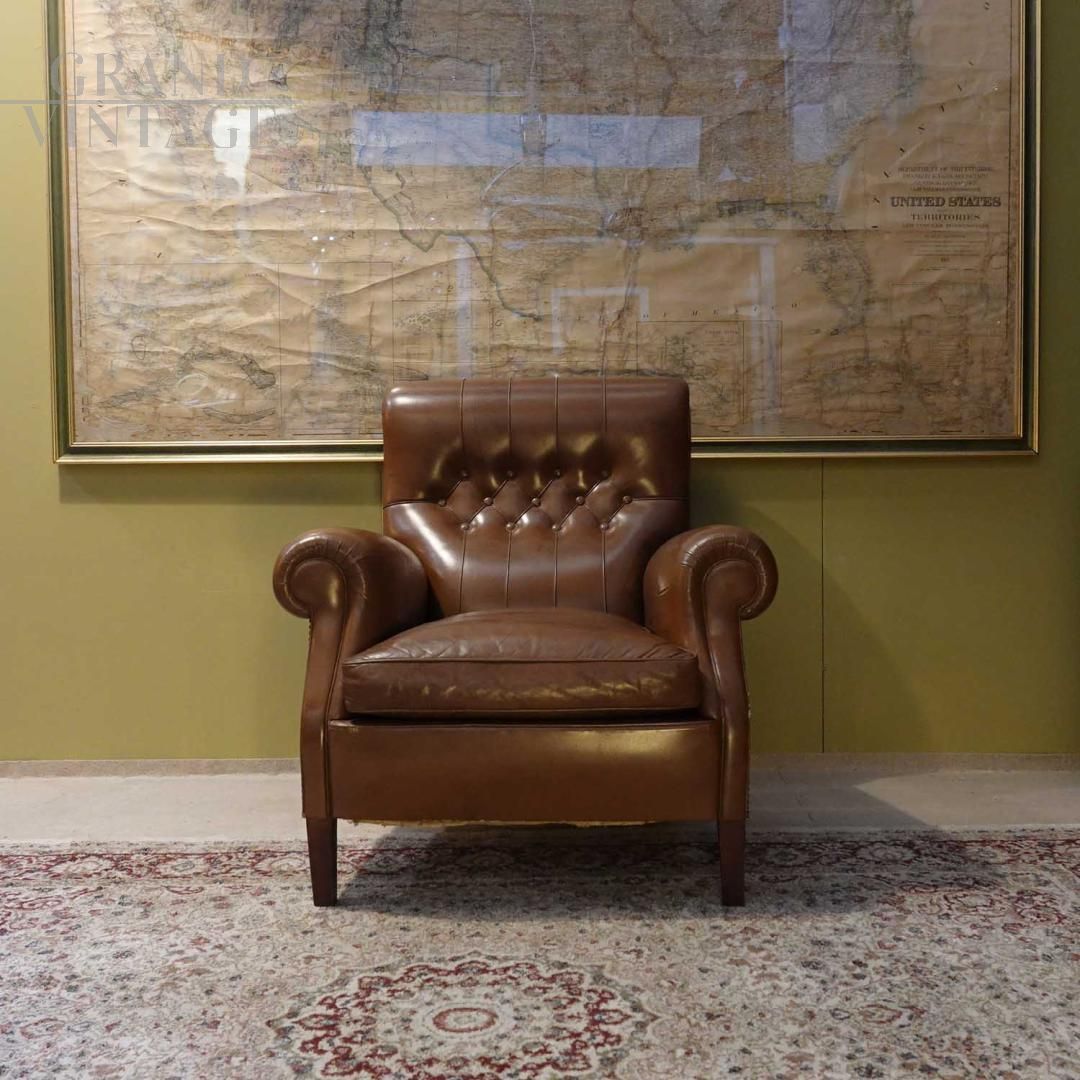 Autentica poltrona in pelle marrone anni ’20, con una patina vissuta che racconta storie di altri tempi. Le linee robuste e il design compatto la rendono un pezzo ricco di fascino, perfetto per ambienti in stile Art Déco, industrial o per chi desidera un elemento d’arredo dalla forte personalità storica.
