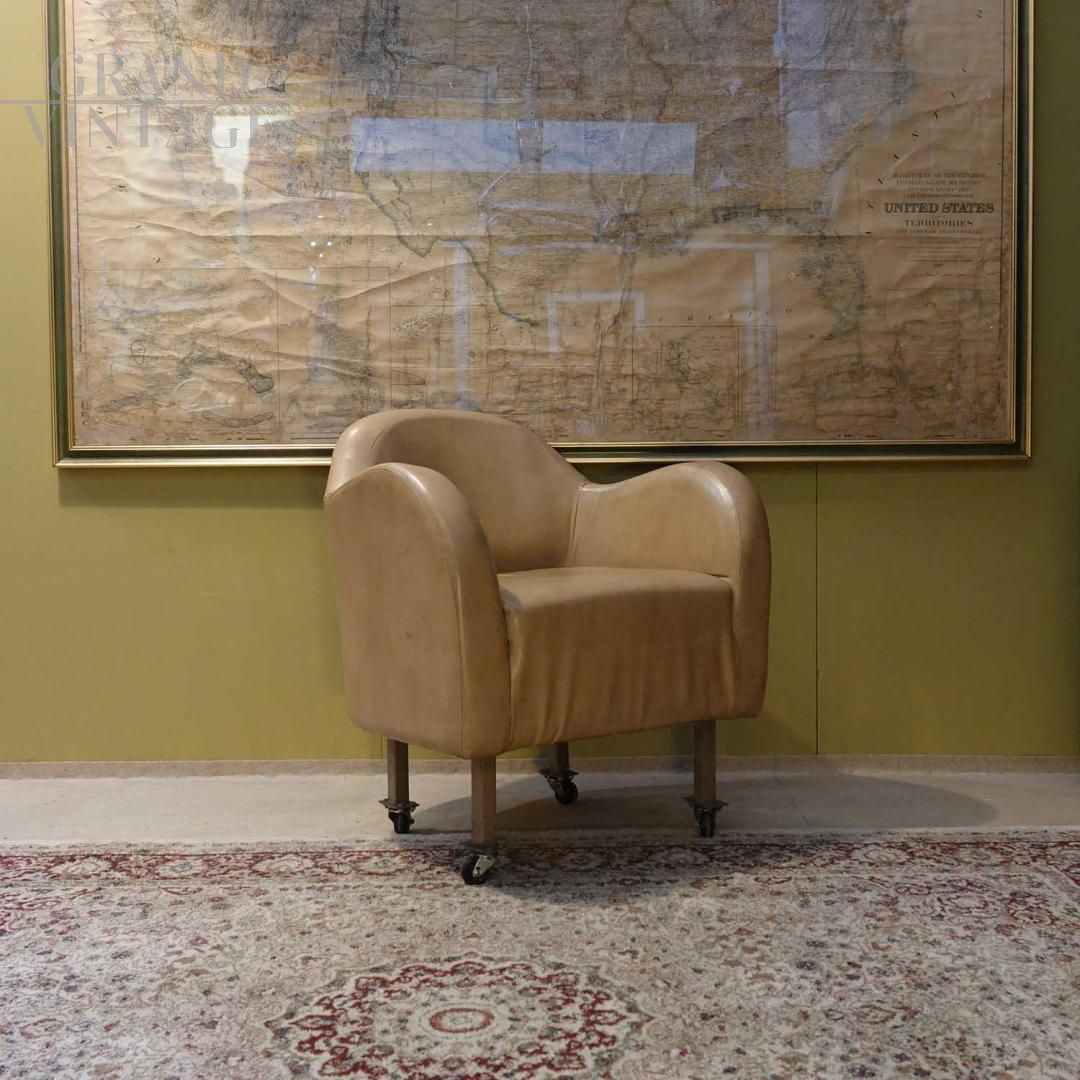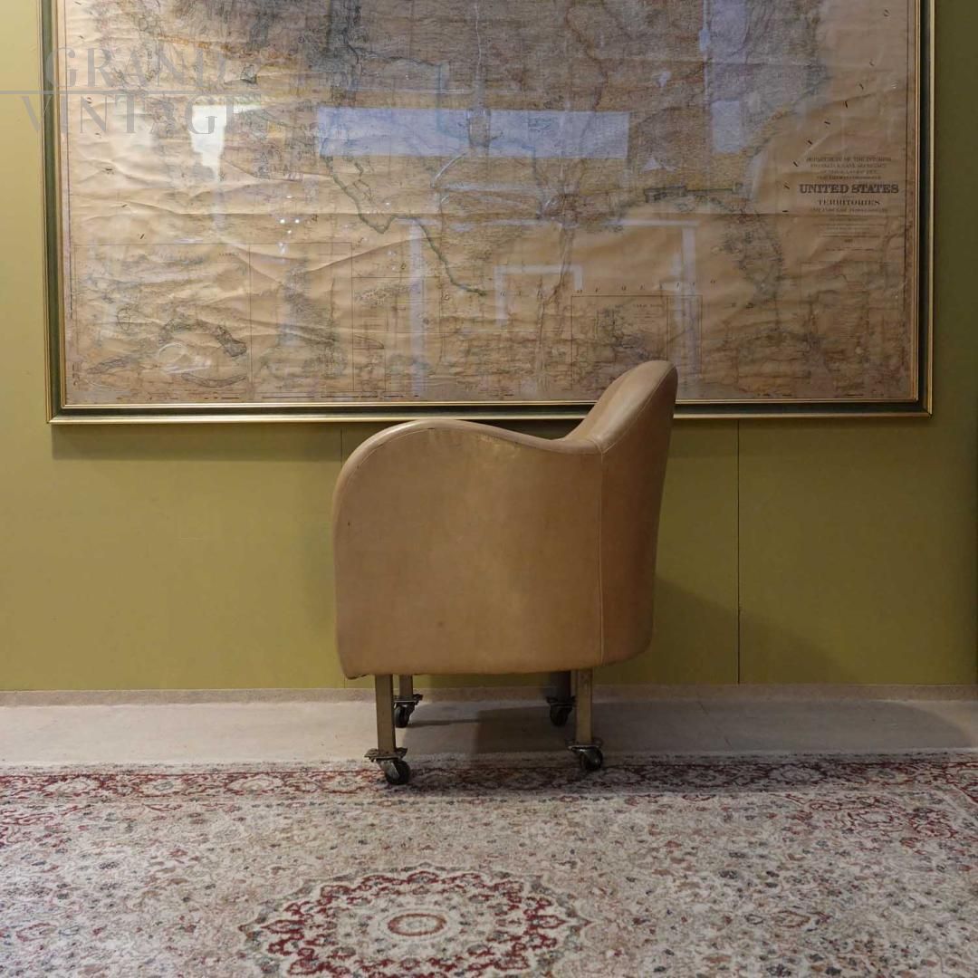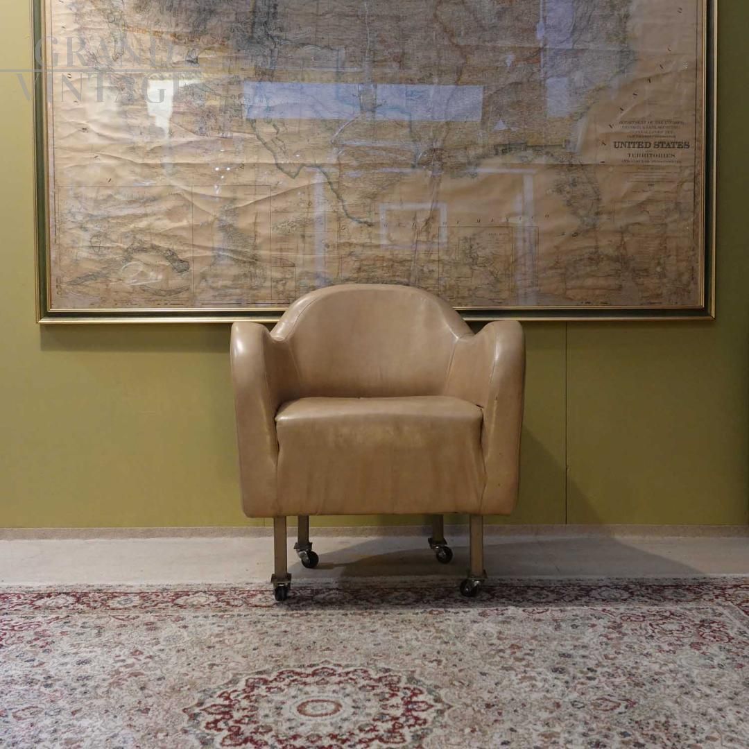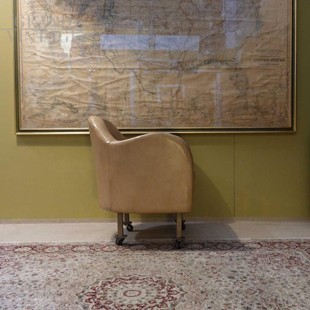 Pratica poltrona con ruote anni ’60, dal design essenziale e funzionale. Caratterizzata da linee pulite e materiali resistenti, è perfetta per uffici, studi o ambienti dinamici dove comfort e flessibilità si incontrano con lo stile vintage.