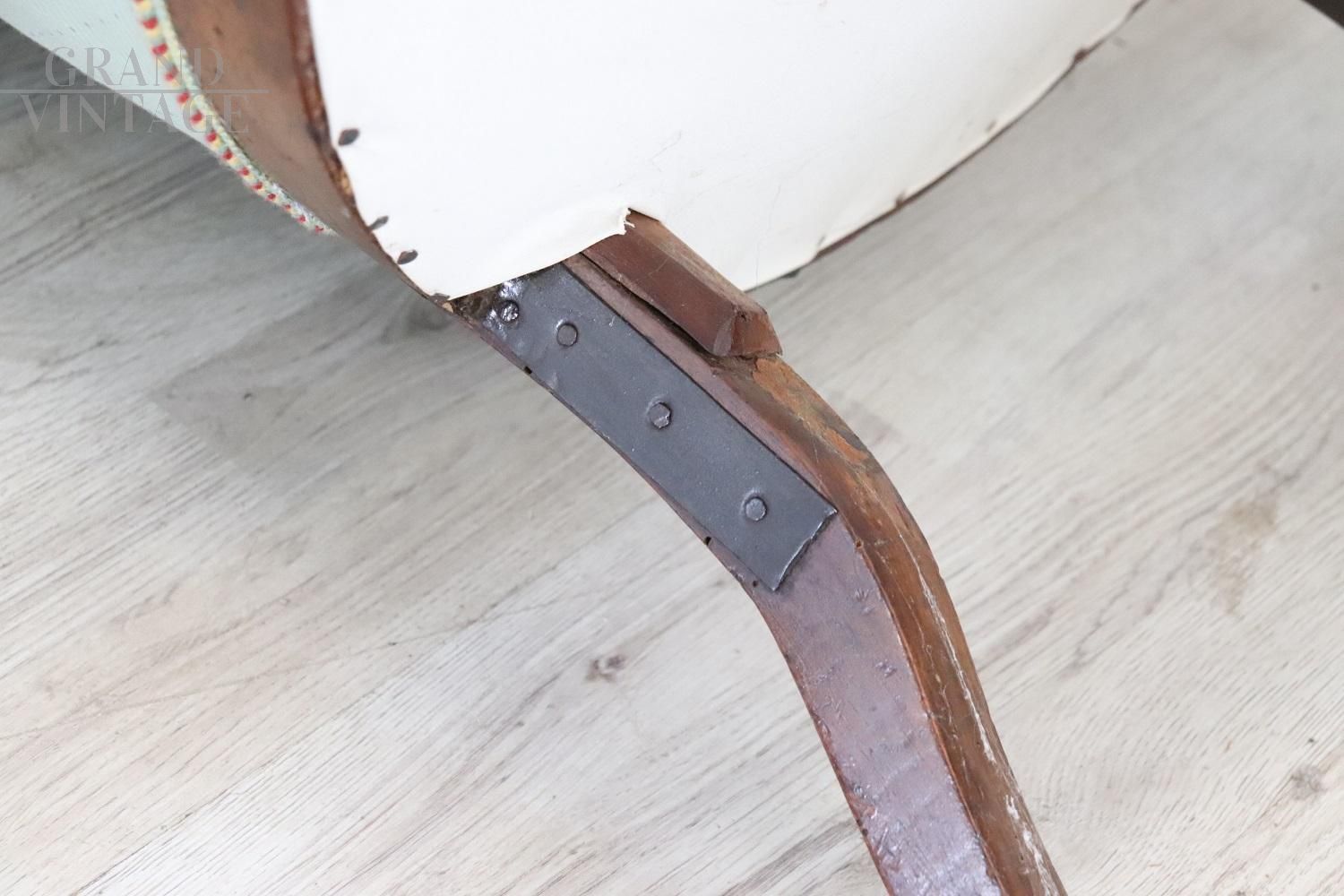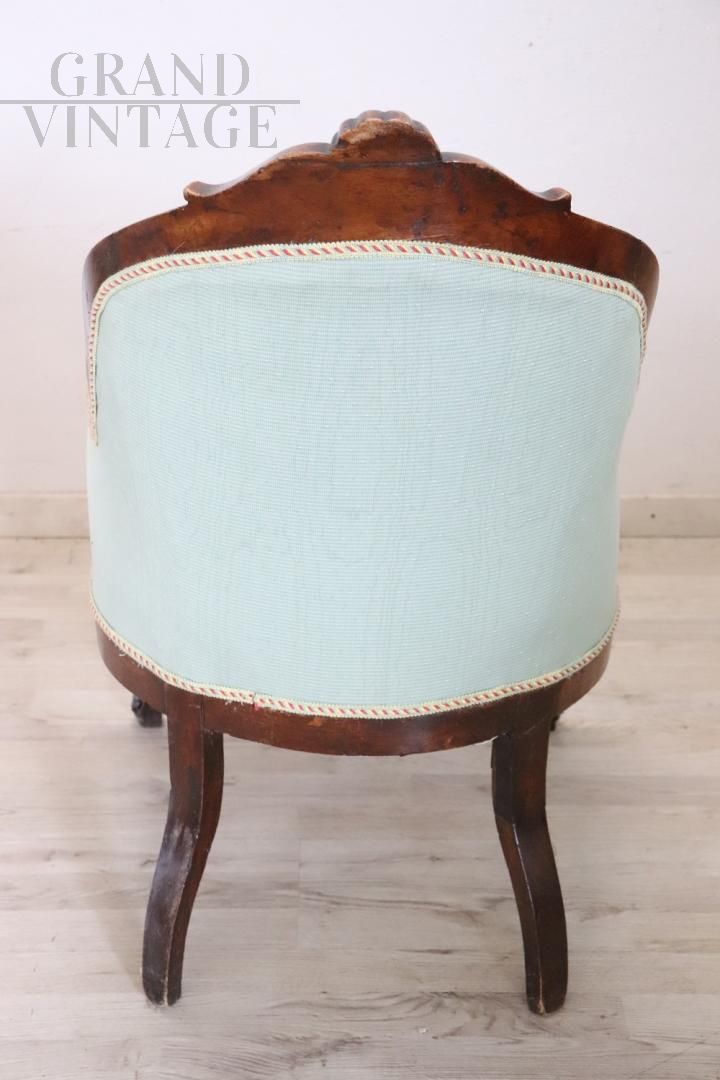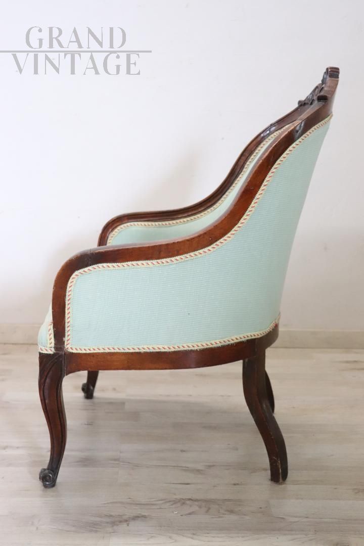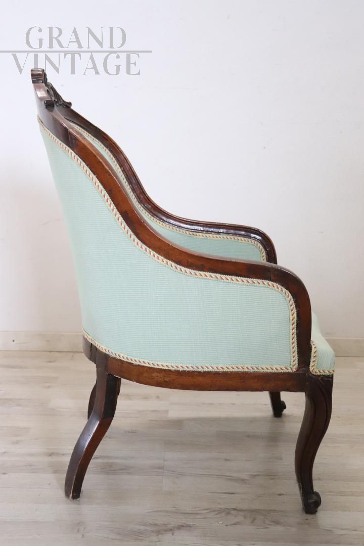 Deliziosa poltroncina antica italiana del periodo Luigi Filippo della metà del XIX secolo, realizzata in legno massello di noce con raffinate decorazioni intagliate nel legno. Di piccole dimensioni, è molto comoda e avvolgente grazie allo schienale imbottito. Queste poltroncine erano utilizzate per arredare le camere da letto. Buone condizioni generali di imbottitura e tessuto, una gamba posteriore è stata restaurata con barra di rinforzo in ferro. Poltrona perfetta per abbellire qualsiasi stanza della vostra casa e utilizzarla per i vostri momenti di lettura o di relax.
