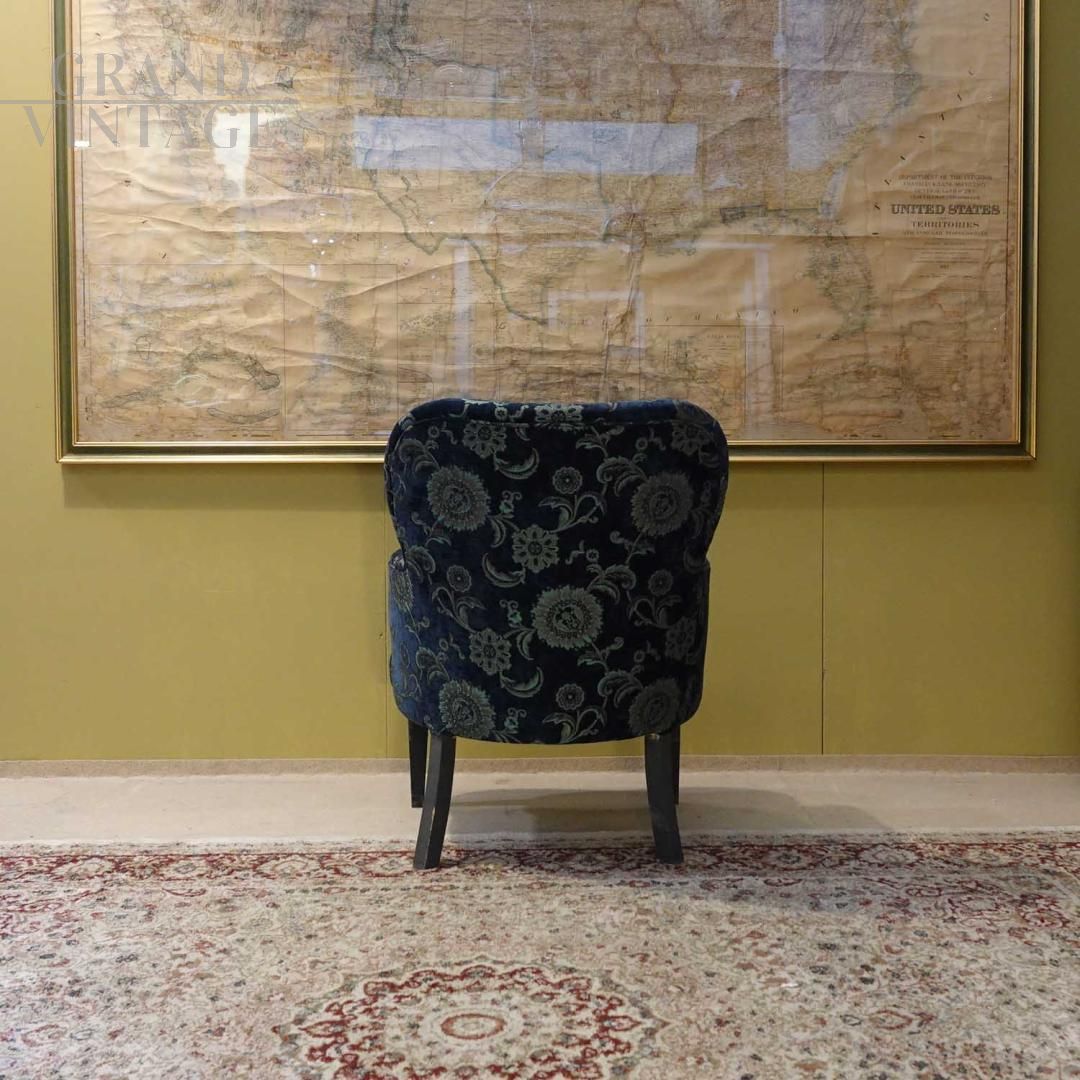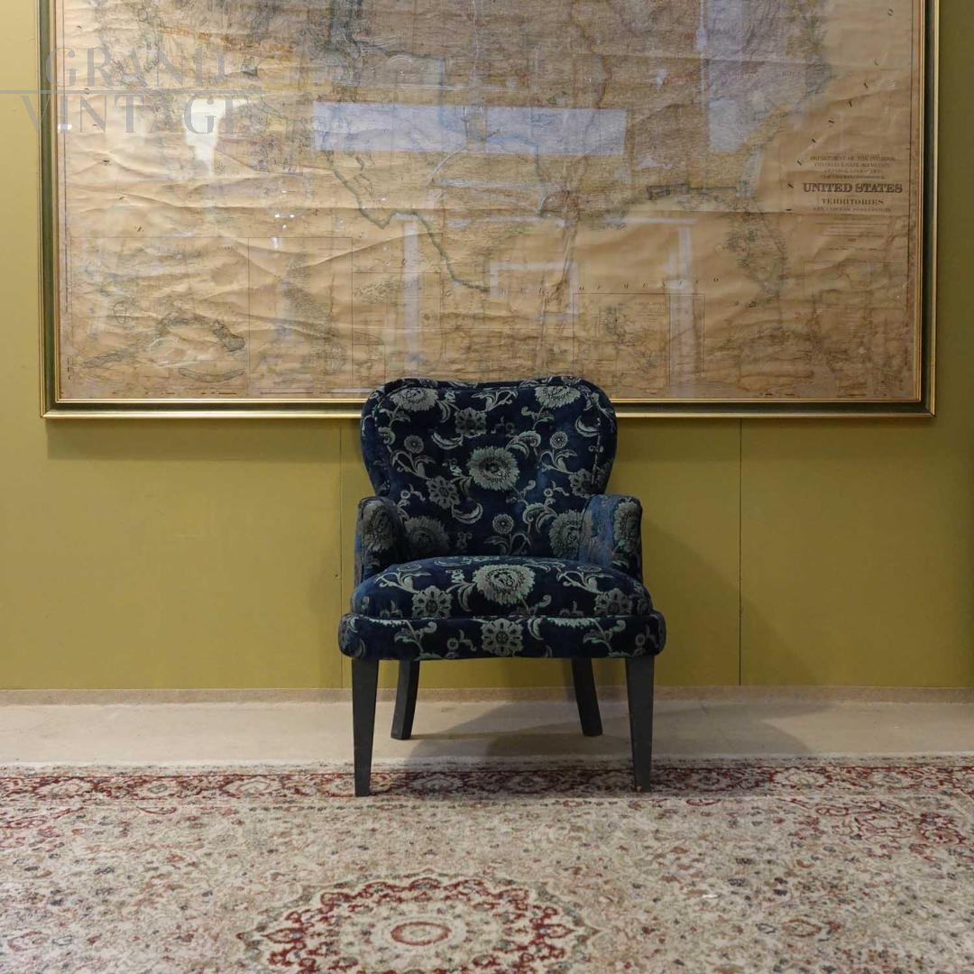 Con il suo rivestimento in velluto blu decorato da un motivo floreale, questa poltrona unisce comfort, eleganza e personalità. Un pezzo unico che dona carattere e vitalità a qualsiasi ambiente, perfetto per arredamenti eclettici, creativi o dallo stile bohémien.