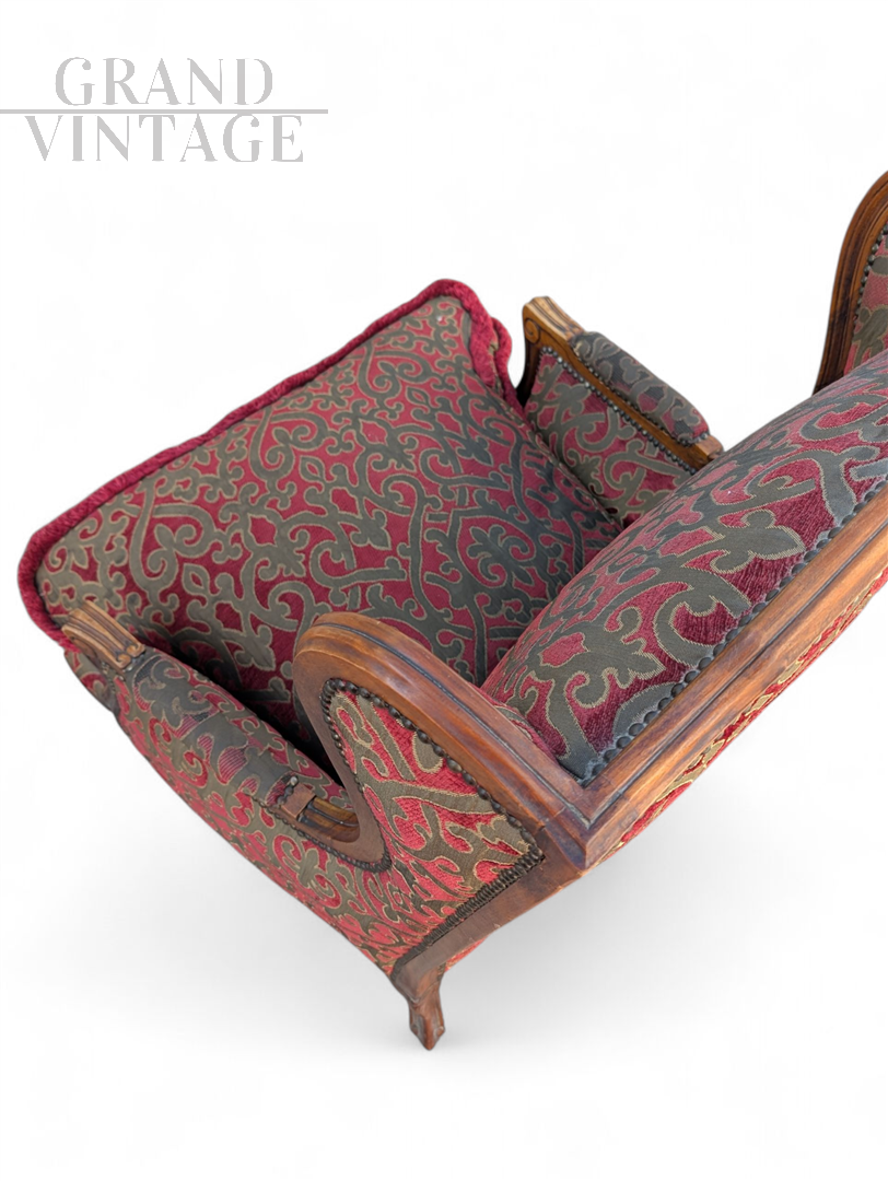 Elegante poltrona Bergère in stile Luigi XV, caratterizzata da una raffinata struttura in legno intagliato a mano, con gambe cabriole e motivi floreali scolpiti. L’imbottitura è rivestita con un tessuto damascato a motivi barocchi in tonalità rosso e oro antico, fissato con una fila di borchie decorative che ne esaltano il profilo. La forma avvolgente dello schienale alto e bombato, unita ai braccioli sagomati e al sedile ampio, conferisce alla seduta un perfetto equilibrio tra comfort e stile classico. Ideale per ambienti d’epoca, salotti eleganti o angoli lettura sofisticati. Dimensioni: Altezza: 105 cm Larghezza: 71 cm Profondità: 70 cm Altezza seduta: 50 cm